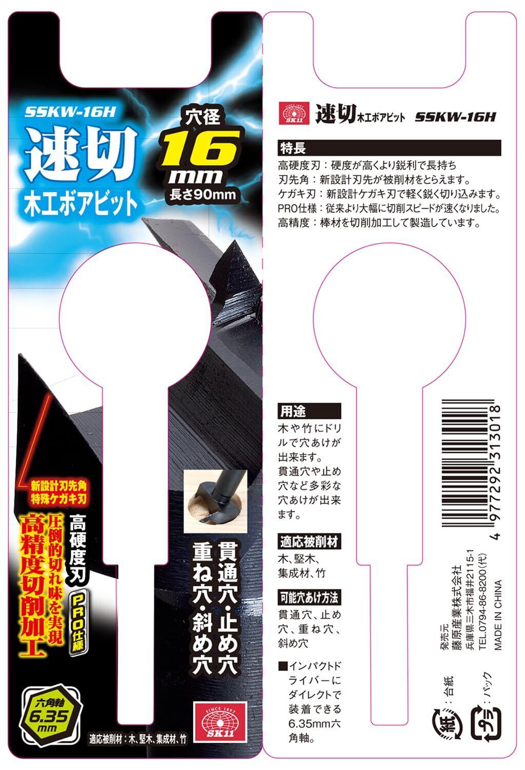 SK11(エスケー11) 速切木工ボアビット 6.35mm六角軸 穴径16×全長90mm SSKW-16H