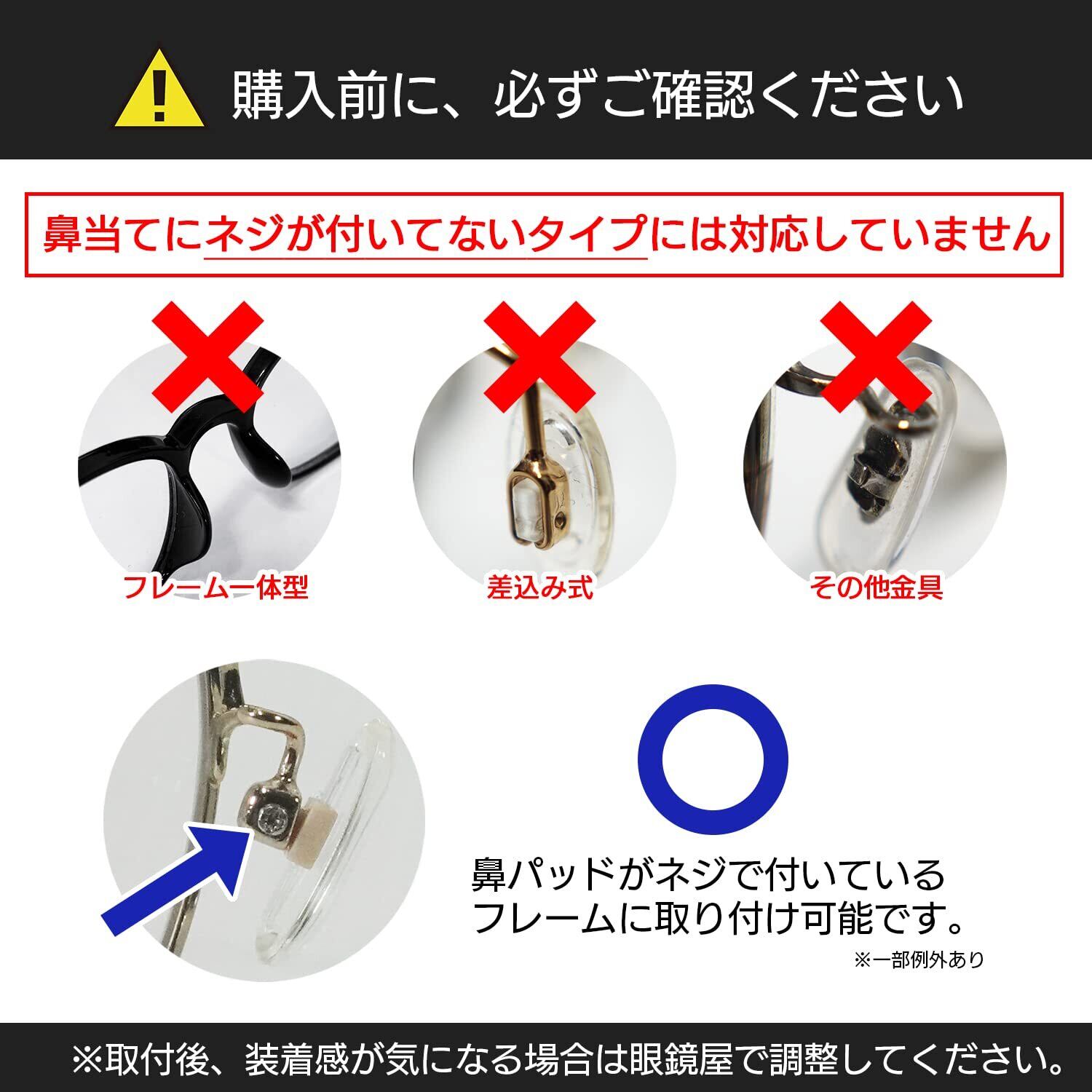 注意:※鼻パッドがついていない眼鏡、鼻パッドがネジで留められていない眼鏡には対応しておりません。※装着感には個人差があります。※アレルギー反応があった場合は速やかに使用を中断し、医師にご相談ください。