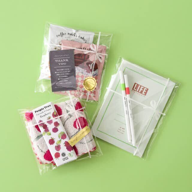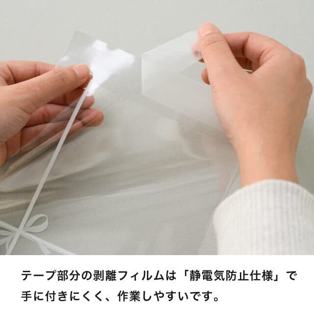 白のリボンデザインが可愛いテープ付OPP袋です。商品を入れてテープで留めるだけで可愛く仕上がります。テープ部分の剥離フィルムは静電気防止仕様で手に付きにくく、作業しやすいのもポイント。大量ギフトの用意にも大活躍します。 イニシャル入りやキャラクターハンカチなどのデザイン入り商品はリボン掛けデザインが映えて特におすすめ。ちょっとしたお祝いや配布用ギフトにもおすすめです。 大量ギフトの依頼が来た時に消費者をお待たせしてしまうのが悩み・・・というお客様のお声から生まれた、カンタン・ベンリ・キレイな時短アイテムです。