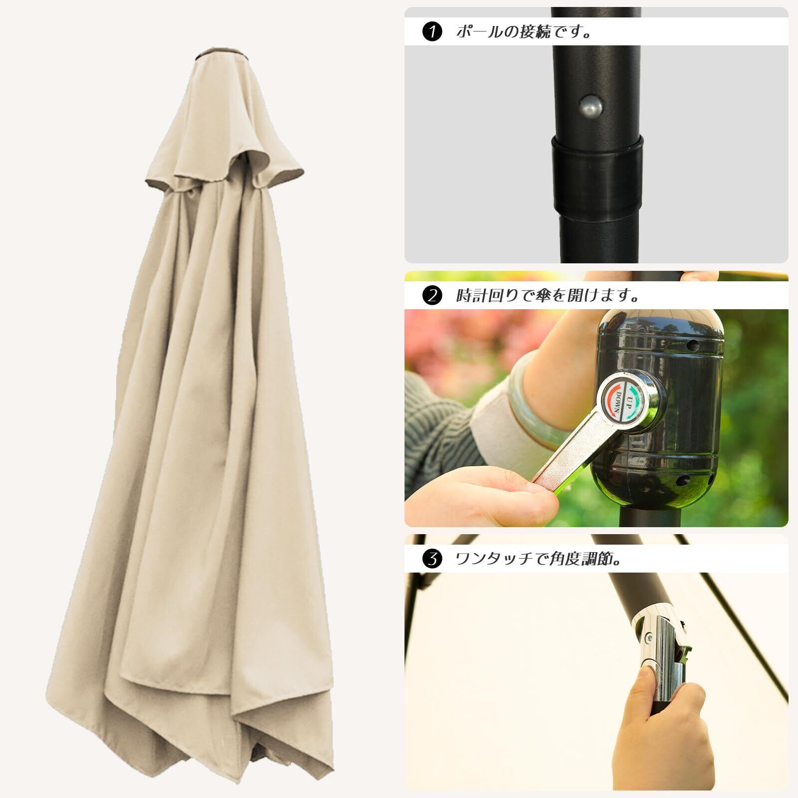 【角度調節可能】傘の開閉はハンドルを回して操作します。時計回りで傘の開閉は楽に完成できます。ワンタッチで、傘を最大30度まで傾斜可能。太陽の動きに合わせて日陰を最適化し、一日中快適なシェードを提供します。もちろん傘が撥水効果あり、雨の日もでも庭で楽々できます。