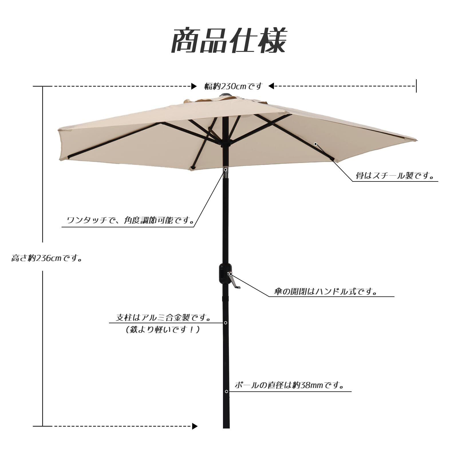 【商品仕様】パラソル本体のみ(ベースは含まていません)。展開時傘直径約270cmで、収納時サイズ約141x14.8x14.8cmです。傘の高さは約236cmです。ポールの直径は約38ミリです。