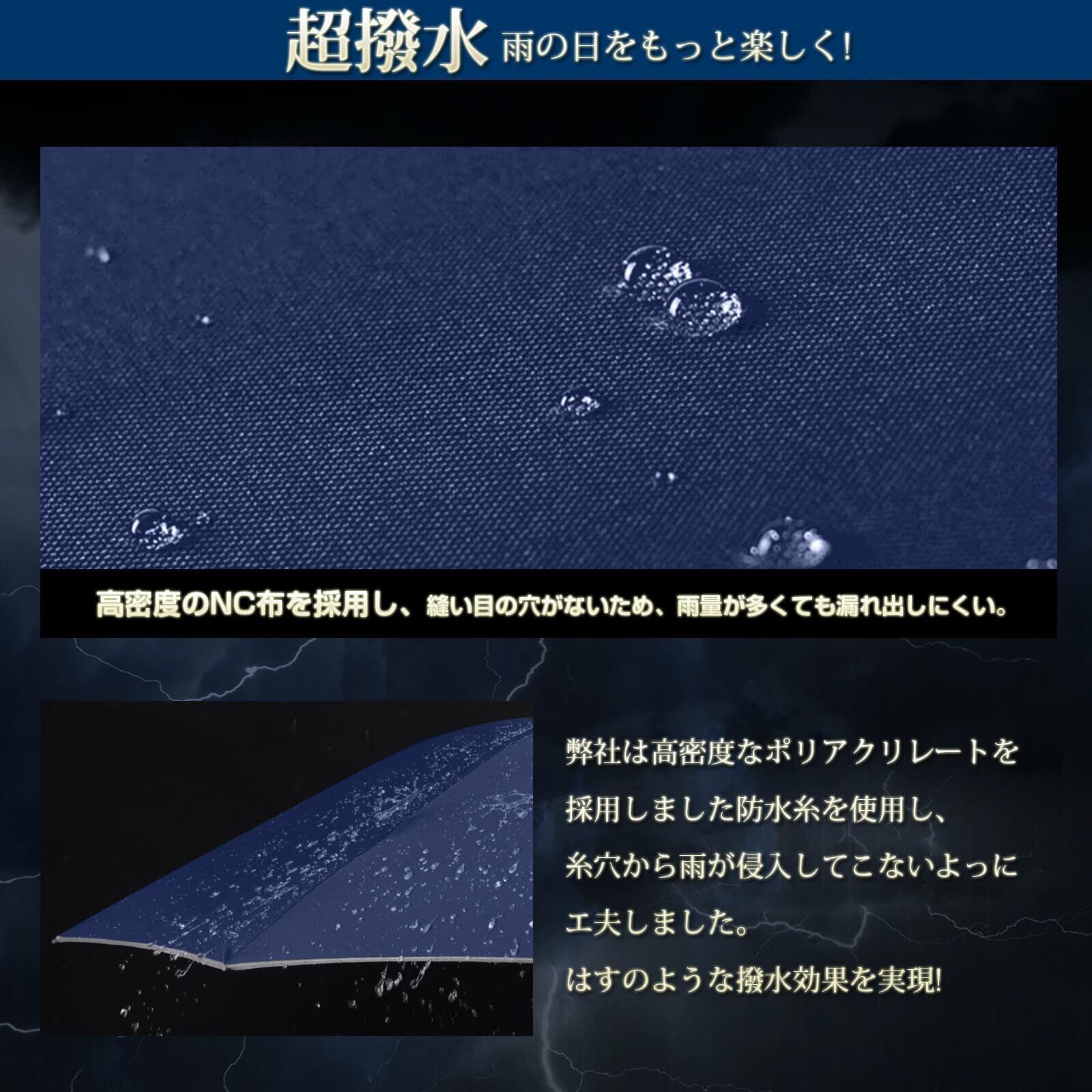 【超撥水性&UVカット】高密度で防水性の高い布地を採用されたことにより、撥水性に優れています。水滴が傘に落ちた瞬間に水玉になりコロコロと滑り落ちていきます。使用後に軽くて振るだけでも傘が乾きます。この折り畳み傘はデュアルコーティング加工を施し、UVカット率99%のある表生地により紫外線を遮断し、黒い裏生地は眩しさを軽減し、地面から太陽熱の暑さを防ぎ、撥水性・遮光性とも優れた晴雨兼用傘です。