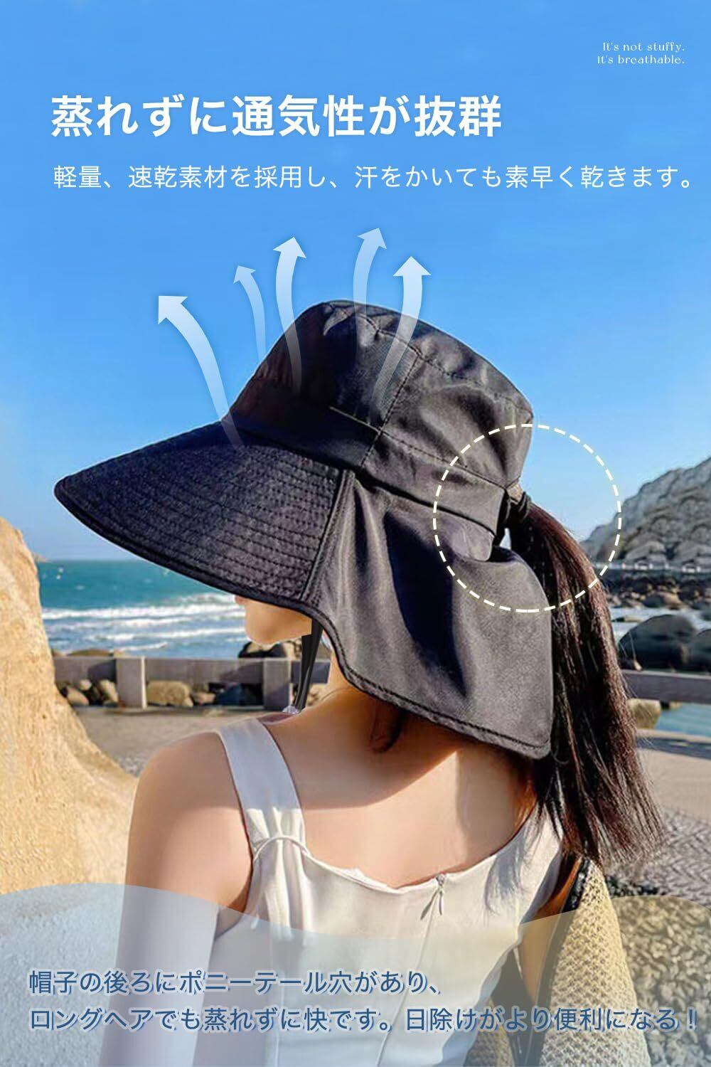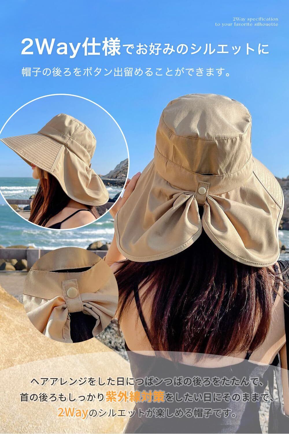 【つば広いデザイン】顔だけではなく、首筋までも紫外線に対策するため、後ろつばは約22cmの長さをプラスしました。大きなつば、日除け垂れ、フェイスカバーが日差しをしっかりガード!帽子の後ろにつばを留めるボタンがあります。ヘアアレンジをした時、つばの後ろをたたんで、美しいヘアスタイルを楽しみながらしっかり日焼けを予防します。