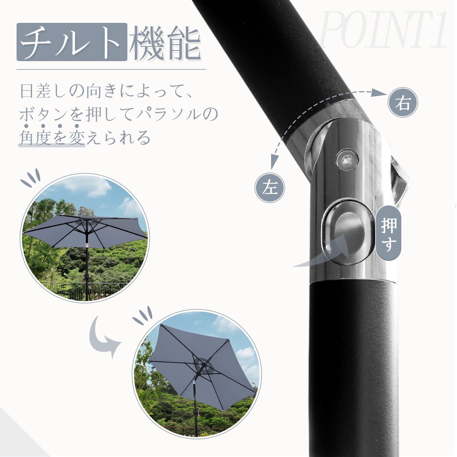 【角度調整可能】:チルト機能も付いているので、ボタンを押すだけで日差しの向きに合わせてパラソルの角度を簡単に変えることができます。日差しを気にせずにアウトドアを楽しむことが可能です。