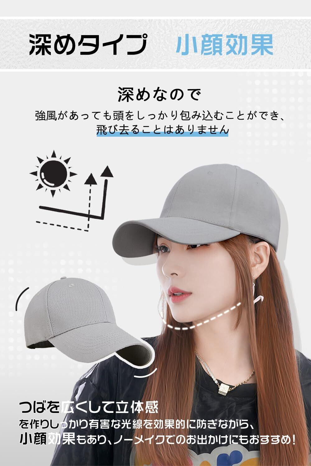 【大きいサイズを選べるキャップ】つばの長さ約:8cm、深さ約:17cm Mサイズ:頭囲55~58CM、XLサイズ:頭囲59~62CM。頭に合う適切なサイズを選ぶことより、快適なフィット感を追求したキャップです。帽子は金属製のバックルで閉じており、調節範囲内であれば無段階でご自身にピッタリなサイズに調整できます。また、大きいサイズの作りとなっているので深めに被ることもでき小顔効果も得られます。