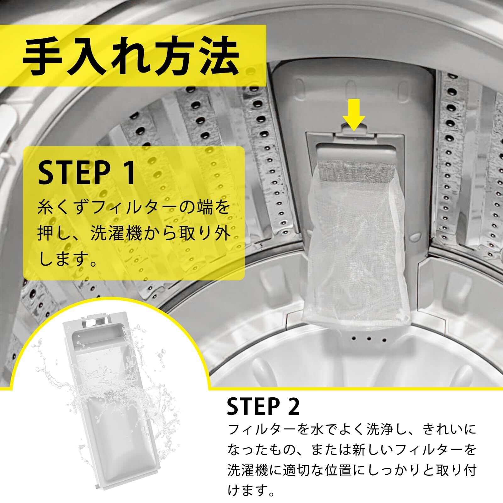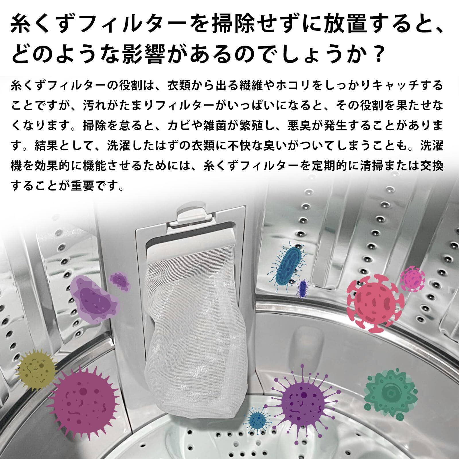 【ご購入前の確認事項】本製品をお買い求めいただく前に、必ずお手持ちの洗濯機の名、機種名、ならびに糸くずフィルターの形状や寸法を確認してください。洗濯前にこれらをチェックすることで、破損や詰まりを防ぎ、ネットの編み目が緩むことによるゴミの取り残しを防ぐことができます。フィルターの劣化を防ぐため、早めの交換をお勧めします。