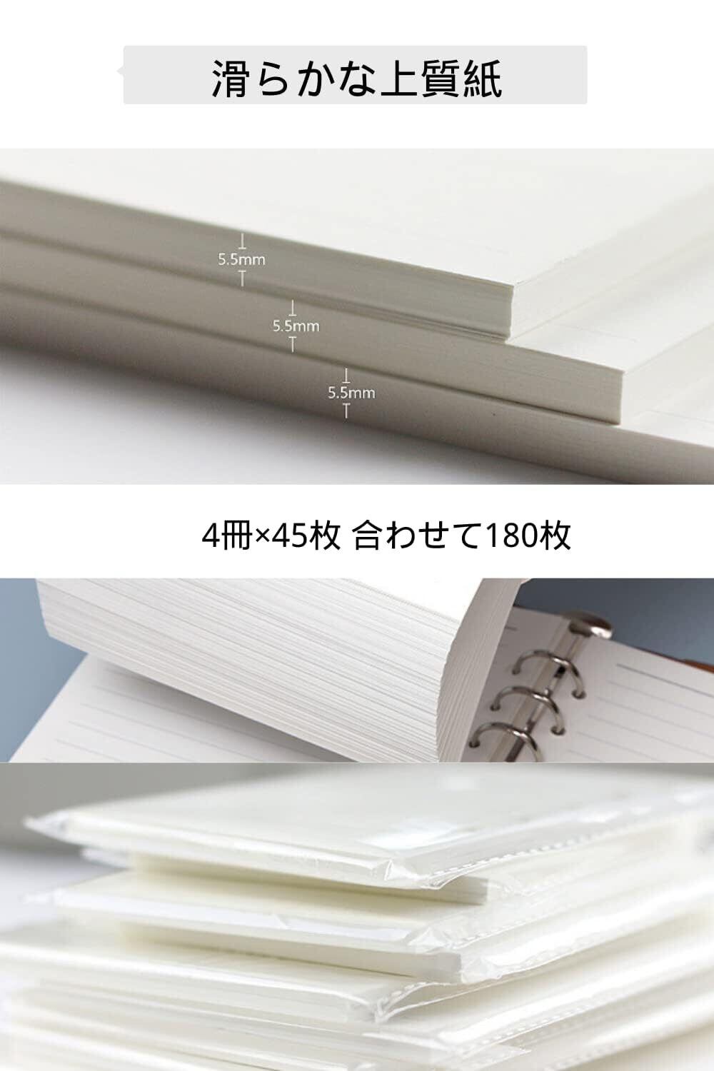 【4冊セット】お得なシステム手帳リフィルセット パッケージ内容:6穴A7手帳リフィル4冊×45枚 合わせて180枚 経済的な360ページ 持ち歩いてちょっとしたメモに最適。