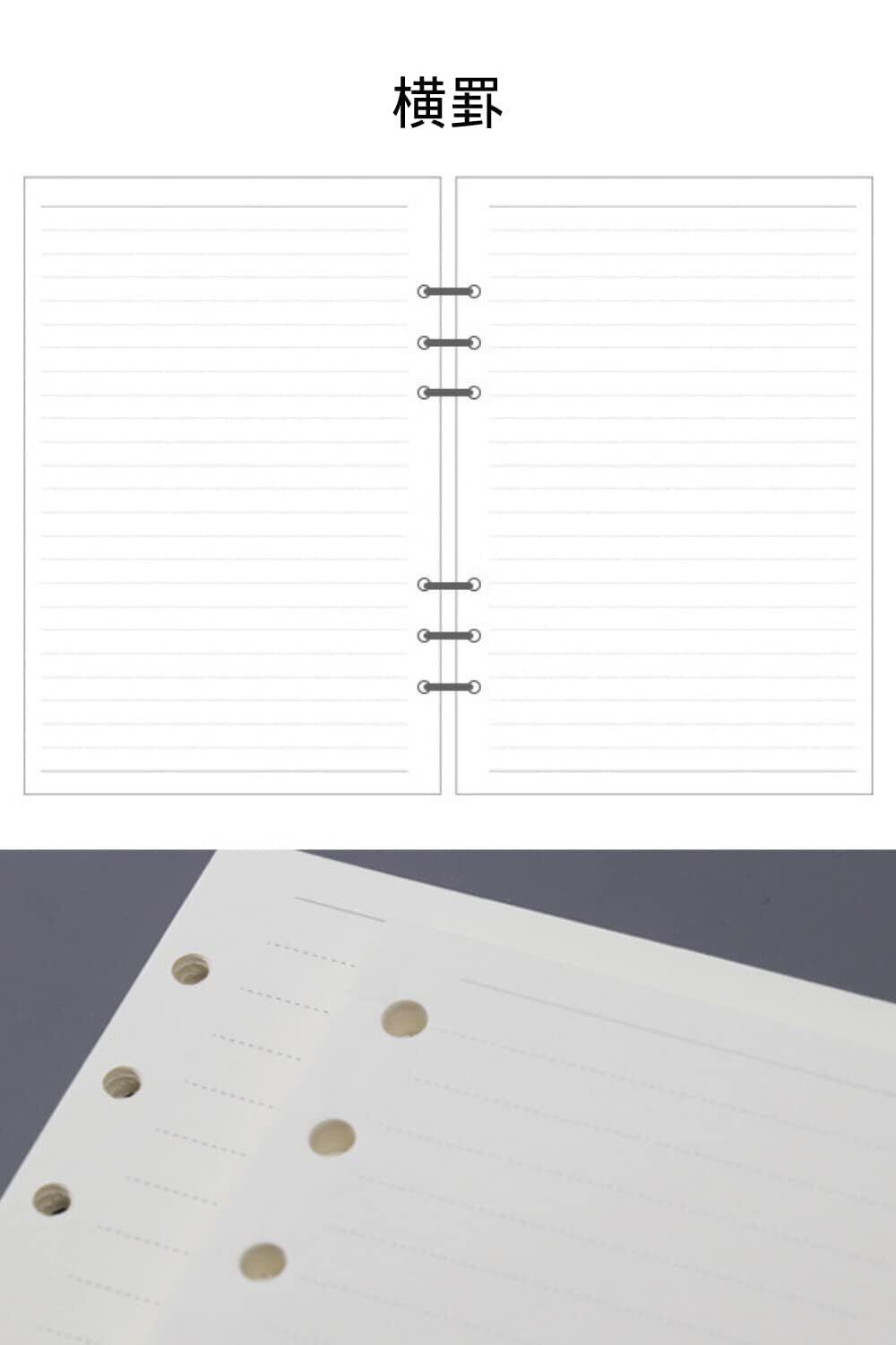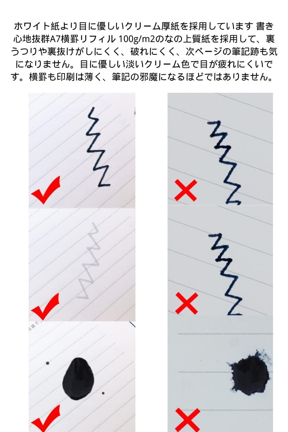 【滑らかな上質紙】 ホワイト紙より目に優しいクリーム厚紙を採用しています 書き心地抜群A7横罫リフィル 100g/m2のなの上質紙を採用して、裏うつりや裏抜けがしにくく、破れにくく、次ページの筆記跡も気になりません。目に優しい淡いクリーム色で目が疲れにくいです。横罫も印刷は薄く、筆記の邪魔になるほどではありません。