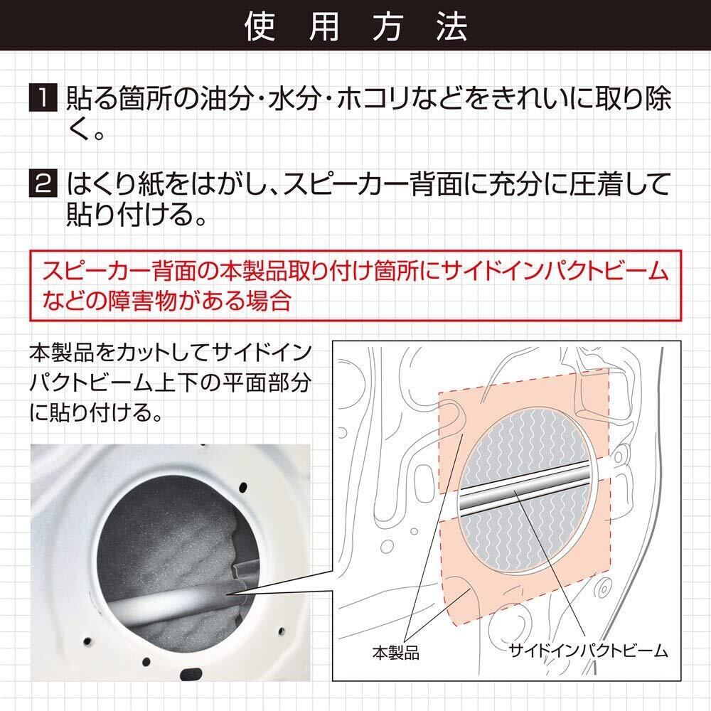 オリジナル3層構造により音がハッキリ聞こえる ・スピーカー背面のドアアウターパネルに貼るだけの簡単施工 ・ドアスピーカー背面の音の反射を効果的にコントロールする