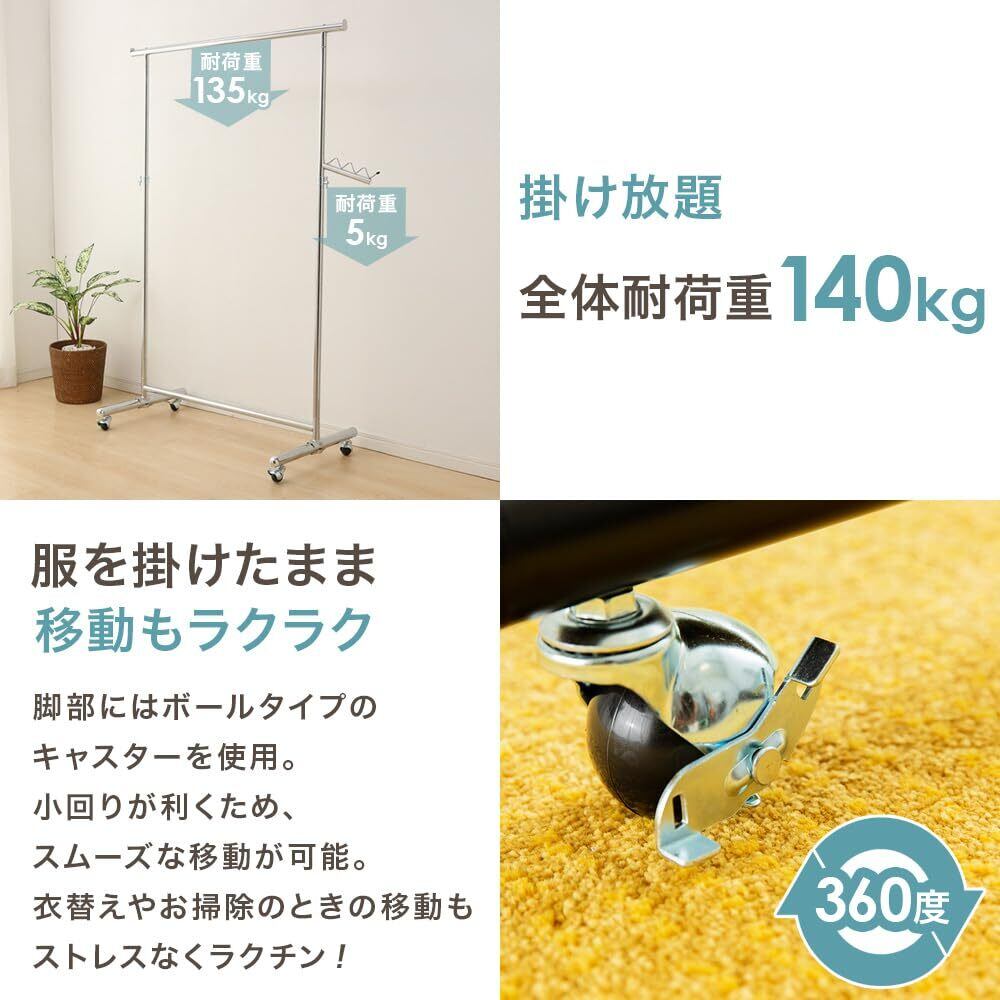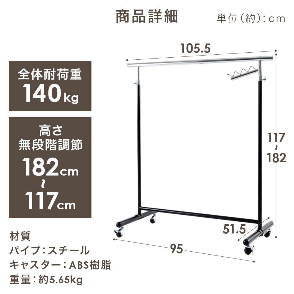 【商品詳細】●商品サイズ(cm):幅約115.5×奥行約51.5×高さ約117-182 ●重量(kg):約5.65 ●材質:パイプ:スチール、キャスター:ABS樹脂 ●総耐荷重:140kg ●ハンガーパイプ部分耐荷重:135㎏ ●フック部分耐荷重:5㎏