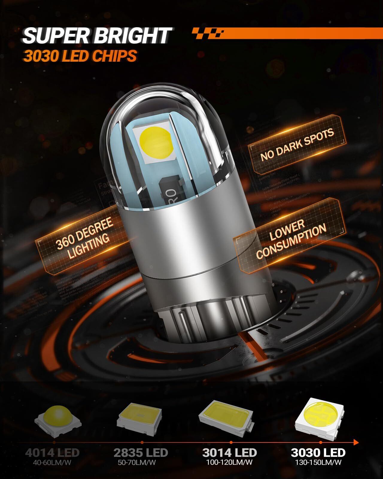 【革新的な3030SMD チップ】高輝度3030SMDチップ3連を採用しており、圧倒的な200LMの明るさに達し、驚異の明るさと視認性を実現します。「全方向照射LED」、「オール拡散ポリマーボディ」、「導光フィン」 のデザインを採用しており、T10 LED 純正電球と交換するだけで、広範囲で均一に照らすことができ、夜間での室内作業などがしやすくなります