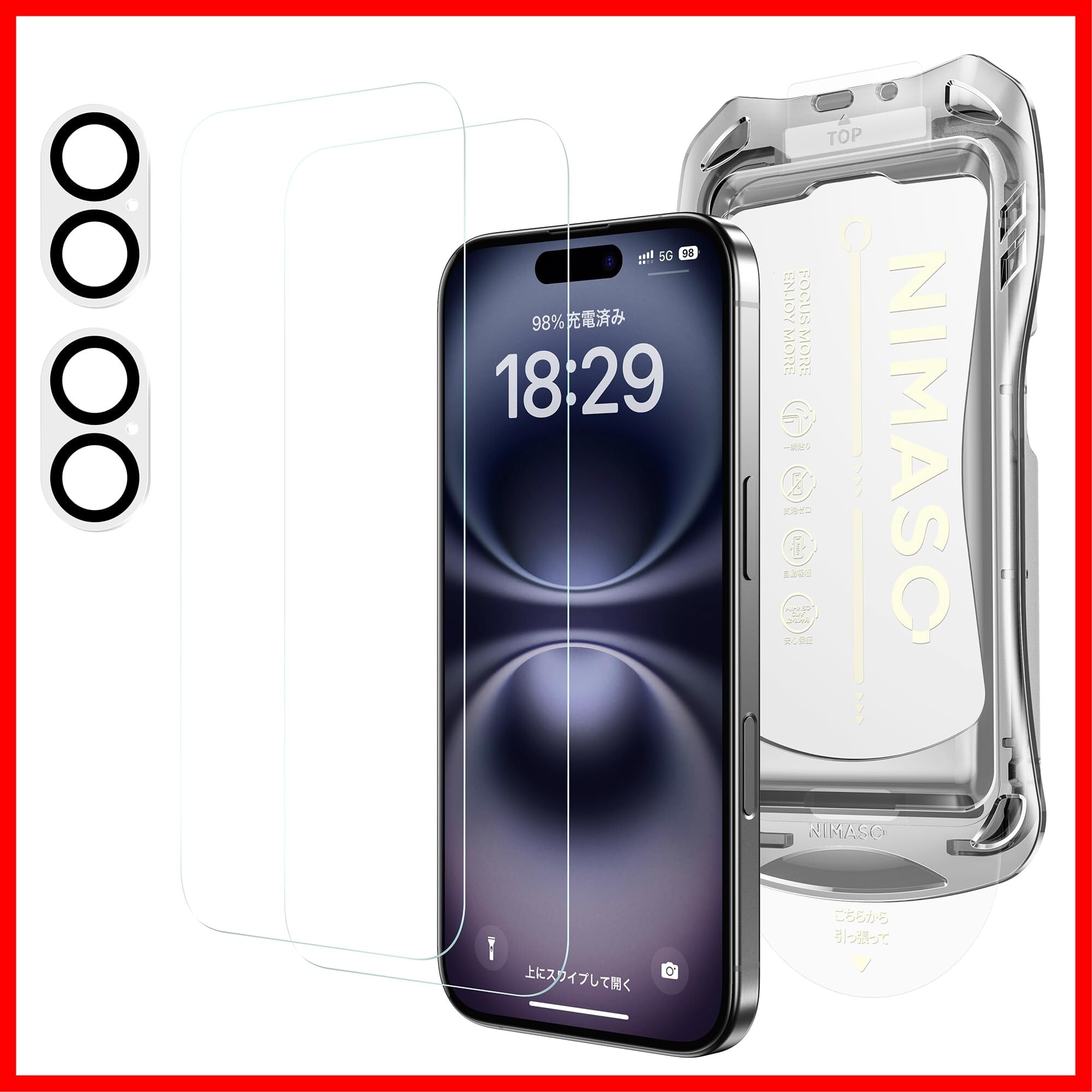 NIMASO ガラスフィルム (2枚) + カメラフィルム (2枚) iPhone 16 Plus用 強化ガラス カメラ 保護フィルム 4枚セット 耐衝撃 指紋防止 ガイド枠付き アイフォン 16 プラス(6.7インチ)対応 DFP24G1386