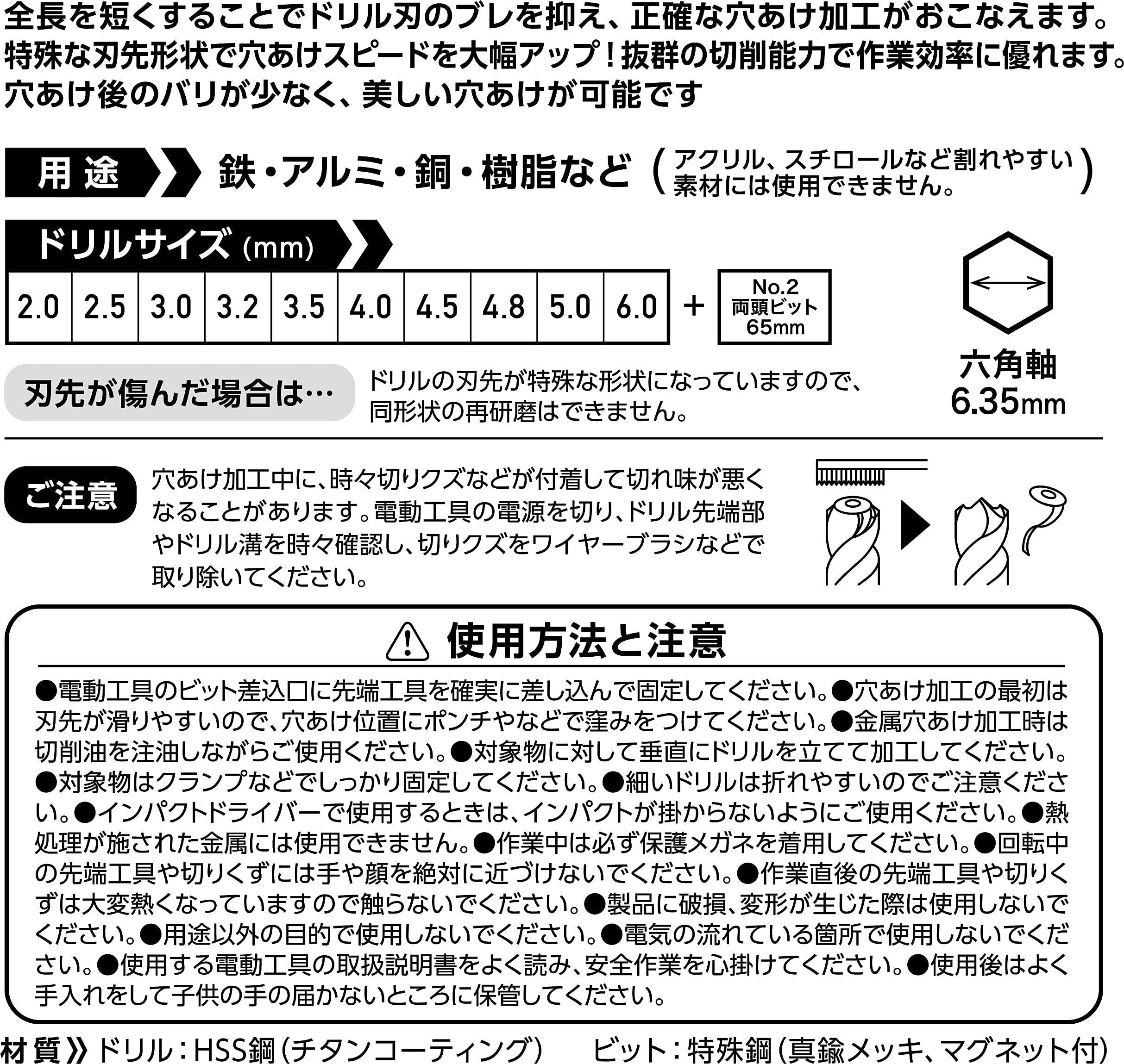 ■全長を短くすることでドリル場のブレを抑え、正確な穴あけ加工が行えます。■特殊な刃先形状で穴あけスピードを大幅アップ! 抜群の切削能力で作業効率に優れます。■穴あけ後のバリが少なく、美しい穴あけが可能です。■セット内容:2.0、2.5、3.0、3.2、3.5、4.0、4.5、4.8、5.0、6.0 ■セット内容(ビット):(65mm)+No2×+No2 ■シャンク径:6.35