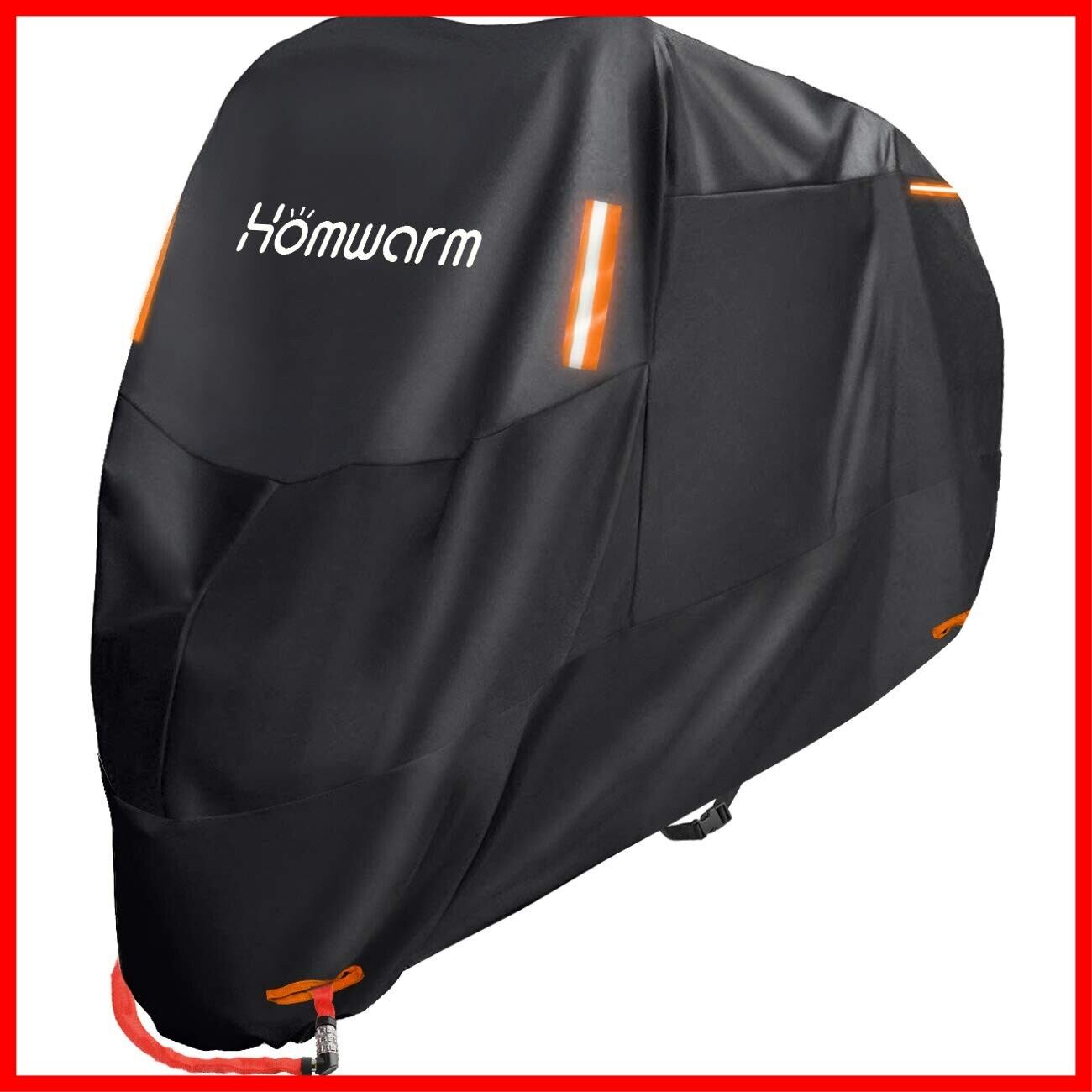 【優しいデザイン】製品正面の警告反射テープが二枚付くだけではなく、安全性を考えると、背面に警告反射テープを二枚追加される、またはチェーンロックの穴が前後両方も付く、錆びやすい金属製の穴に比べて、こちらが採用された布の縫製の穴の方がいい。裾を絞るゴムとワンタッチバックル付きの設計で、カバー飛びをよくに防止。