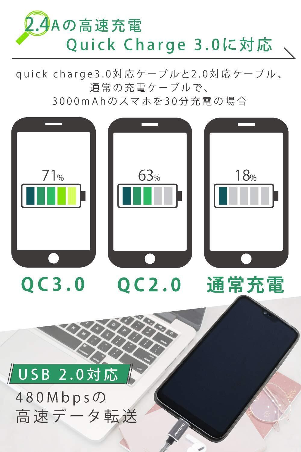 2.4Aの急速充電対応 Quickcharge 3.0 QC クイックチャージ USB2.0 480Mbps : 最大480Mbpsのデータ伝送速度に対応