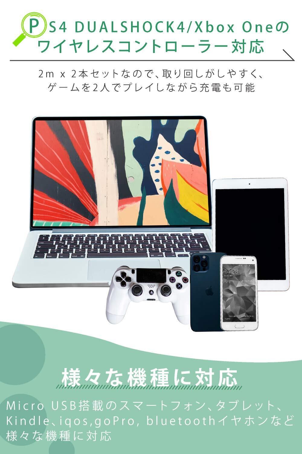 PS4 DUALSHOCK4/Xbox Oneのワイヤレスコントローラー対応 : 長さが2mと長く、プレイステーションやXboxなどのコントローラーを充電しながらプレイ可能 純正 以上の性能を実現