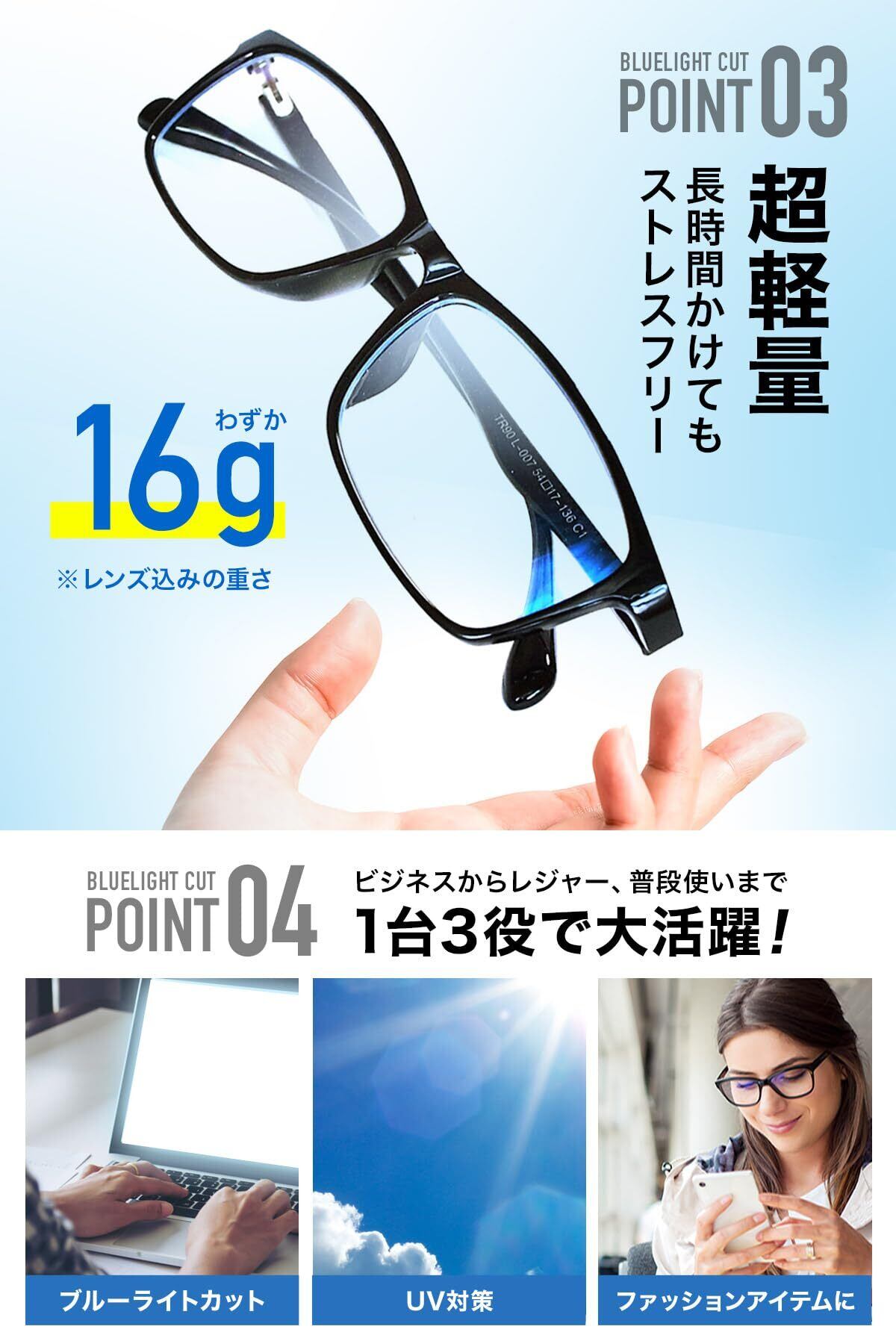 【超軽量フレームTR90】軽量で弾力性に富んだ人気のフレーム素材の一つであるTR90を採用しました。 メガネをかけているのを忘れてしまうくらいの掛け心地と、顔の形・幅に合わせてしなやかに優しくフィットするので、頭部への締め付けを与えずで長時間の着用でもストレスフリー。