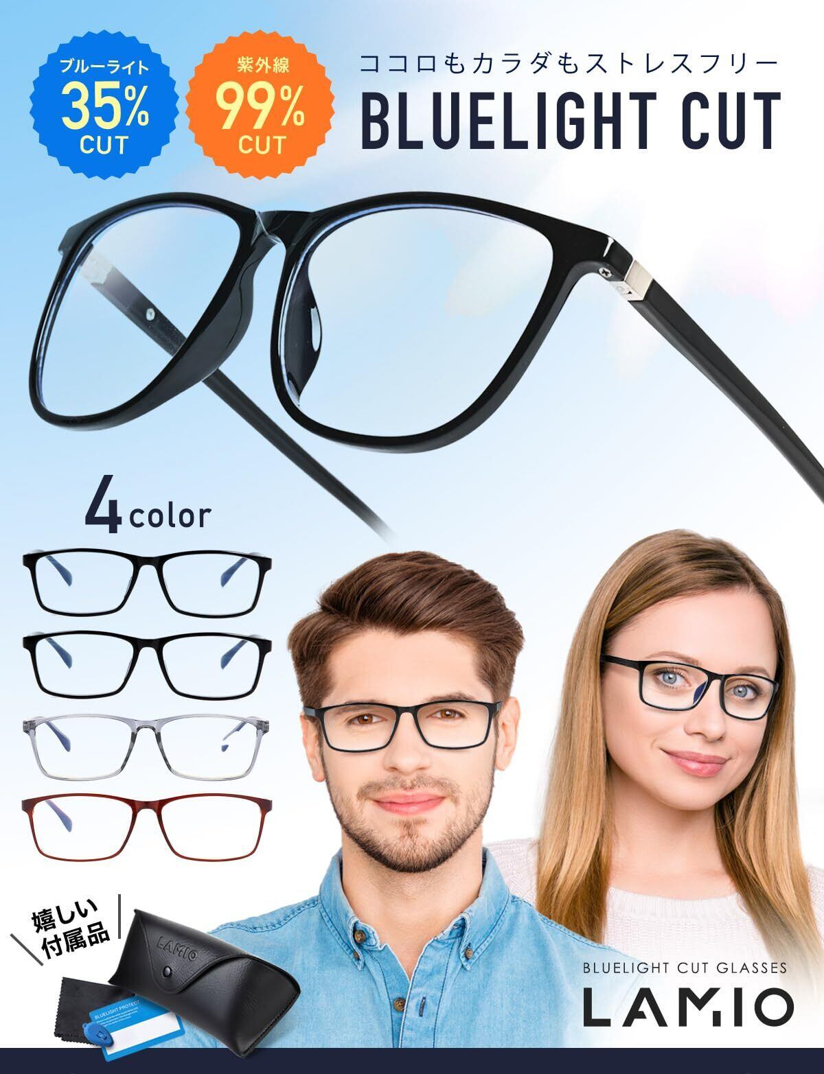 【充実の付属品】PC用メガネ本体・メガネケース・メガネクロス・ブルーライトテストキット