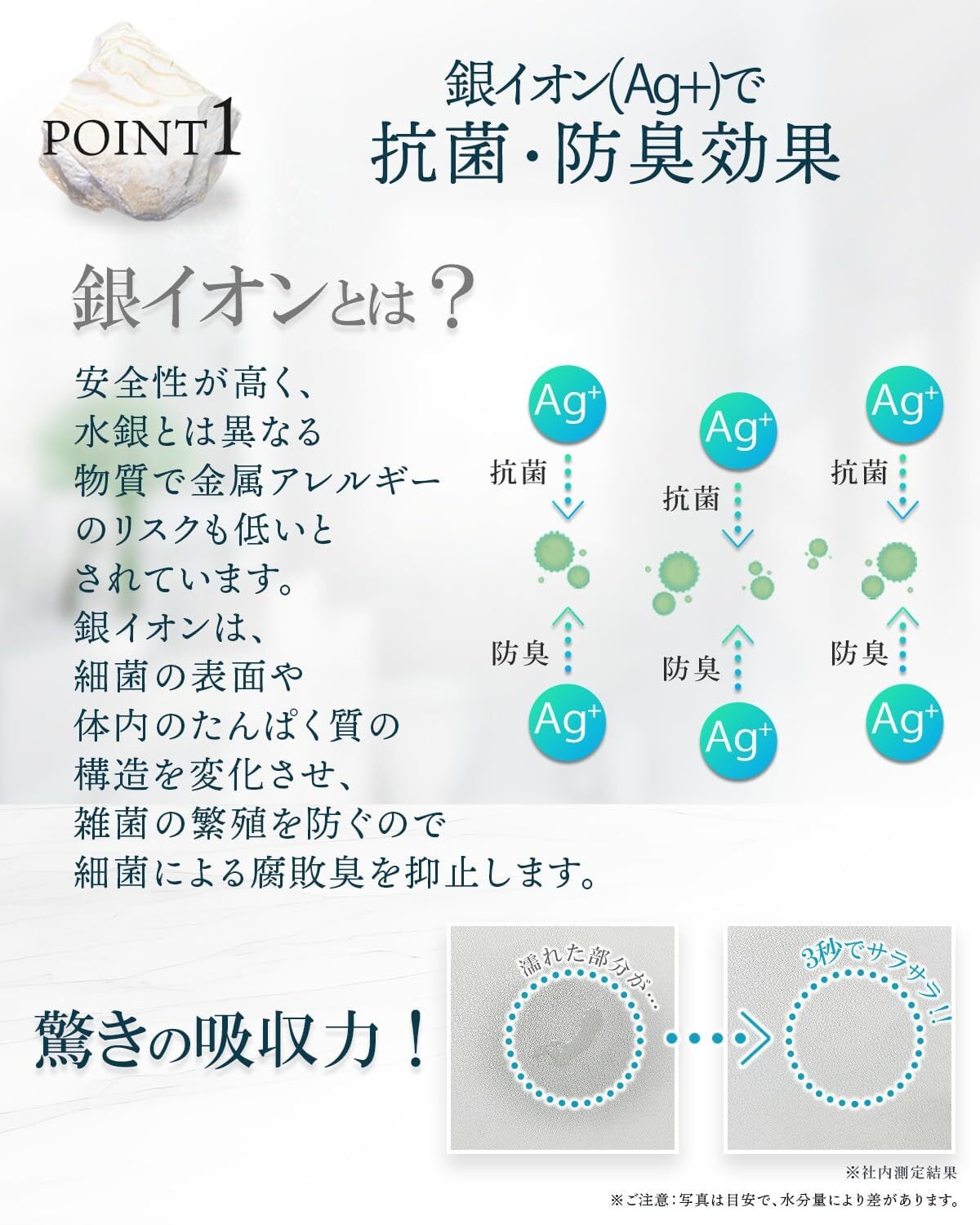 【銀イオン配合】抗菌・防臭の効果があります。細菌の表面や体内のたんぱく質の構造を変化させ、雑菌の繁殖を防ぐので細菌による腐食臭を抑止します。
