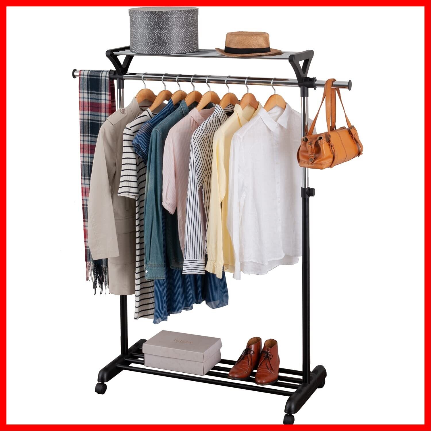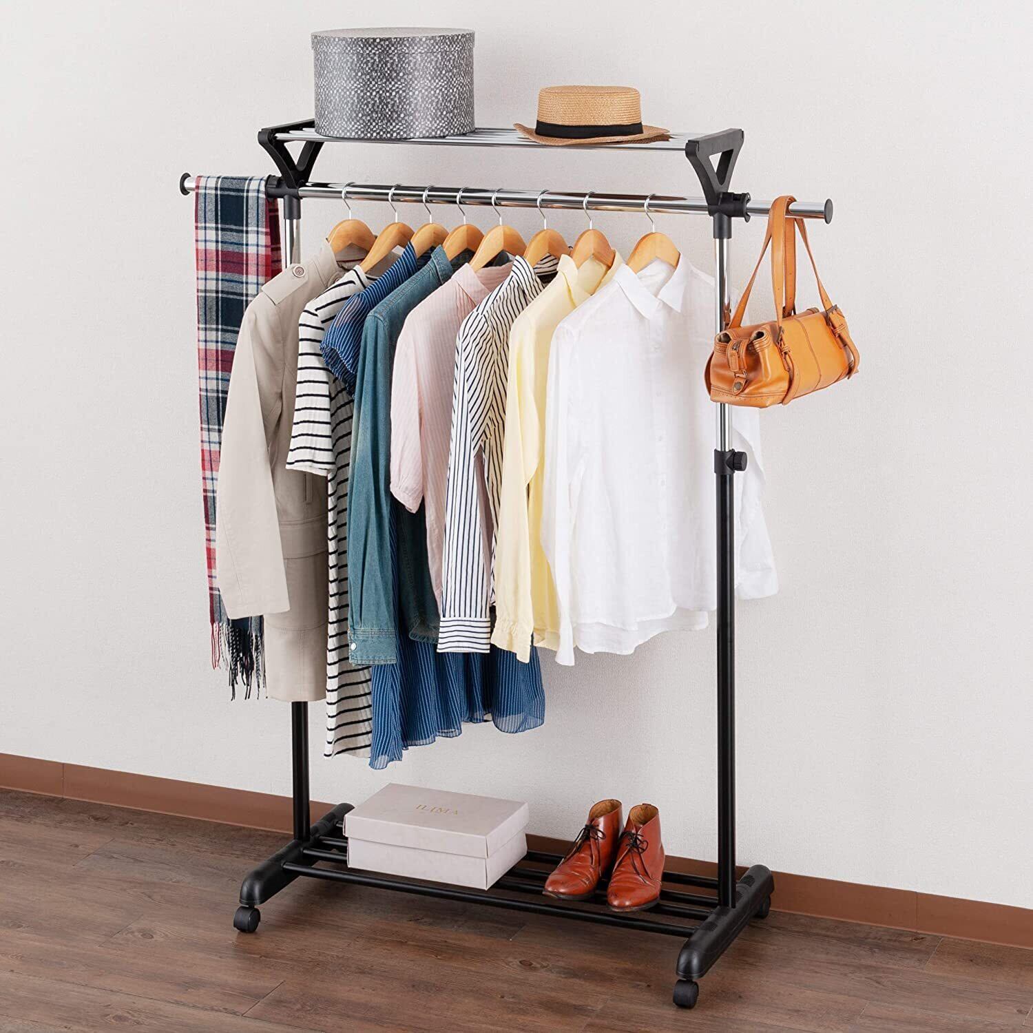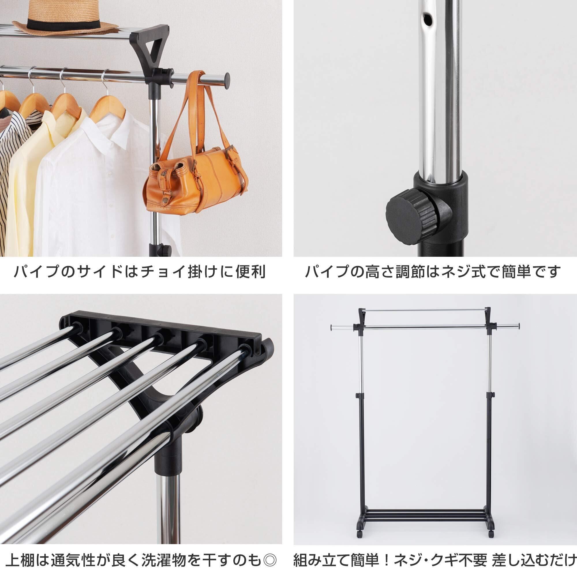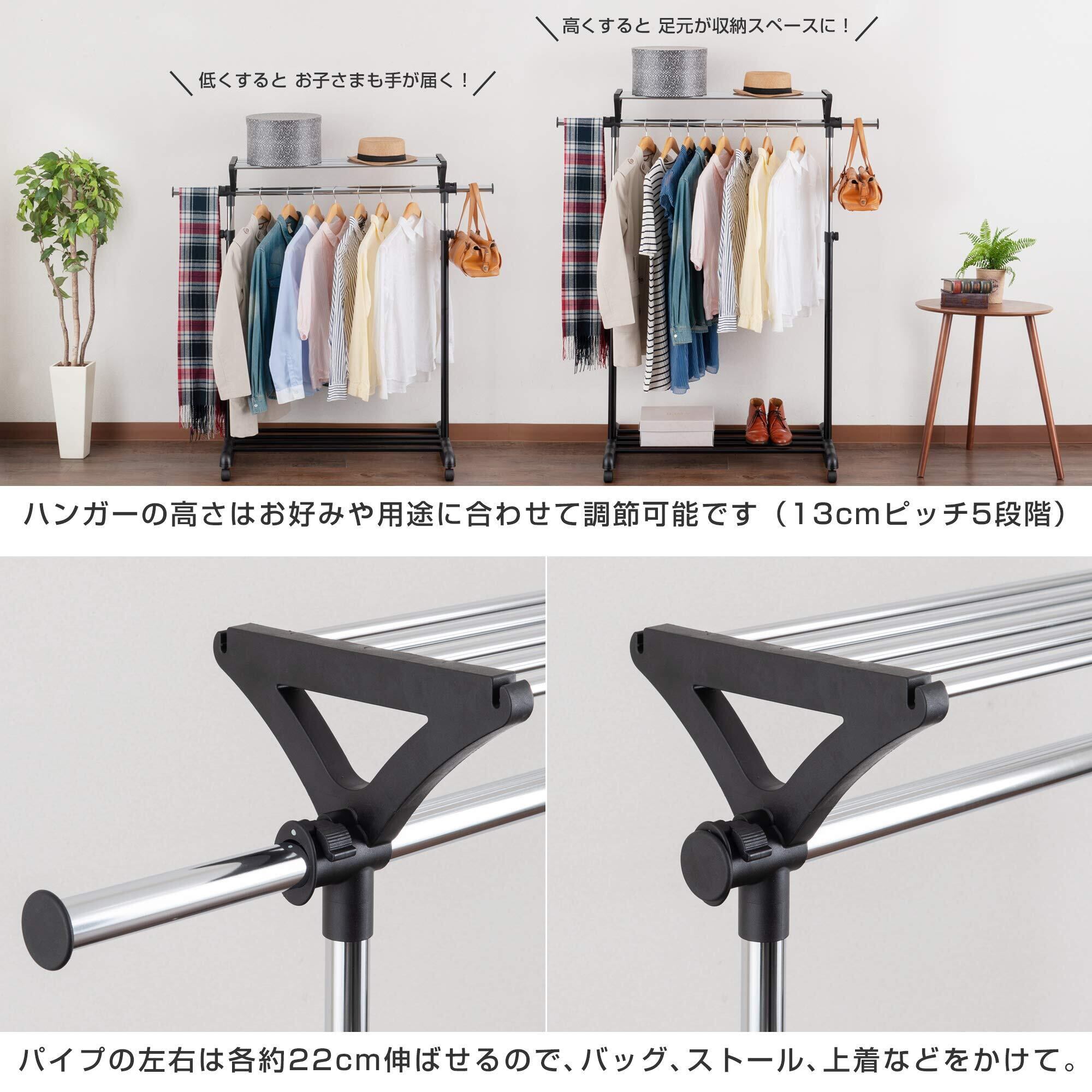 ドウシシャ ハンガーラック 掛ける・置ける 上下棚付き 縦横伸縮 パイプハンガー 全体耐荷重22kg 頑丈 キャスター付き シングル 黒 大容量 おしゃれ 洋服収納ラック パイプハンガー 服掛け 衣類 押入れ 室内干し MUH-90BK
