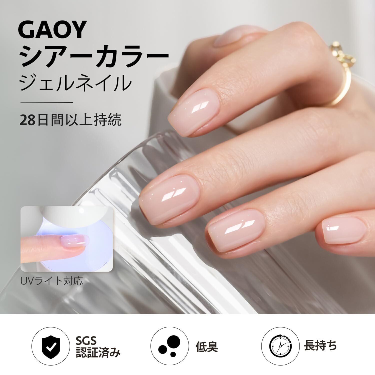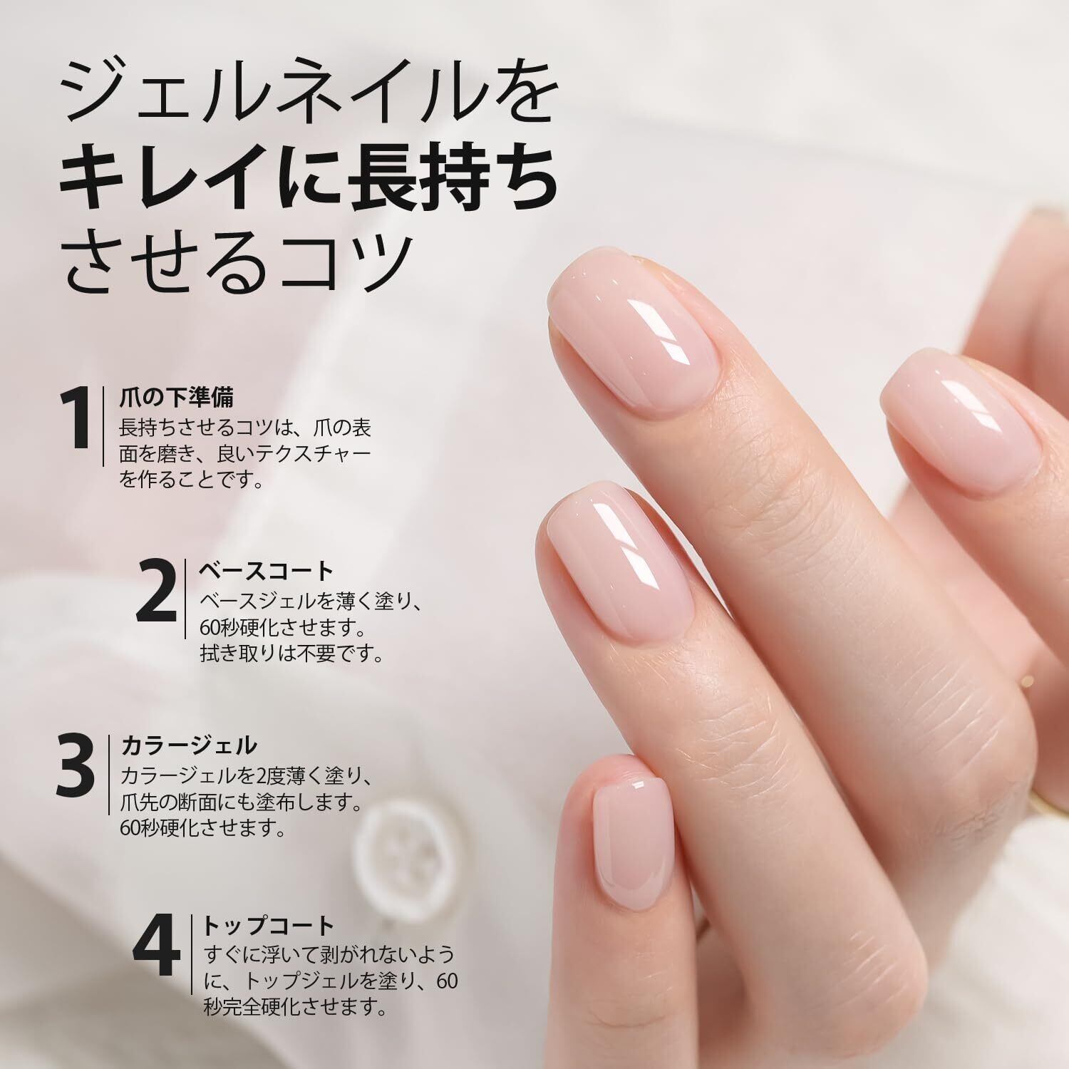 4週間長持ち: ベースジェルを塗る前に爪の表面をなめらかに整えると、良いテクスチャーを作ります。カラージェルの後にトップジェルを塗ると、 みずみずしい光沢のある仕上がりになります。