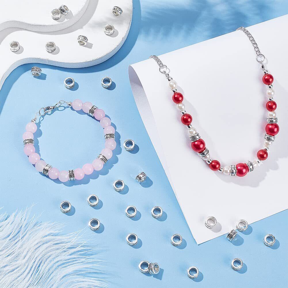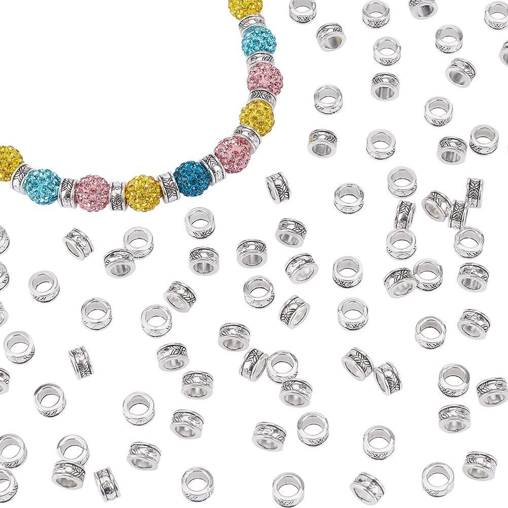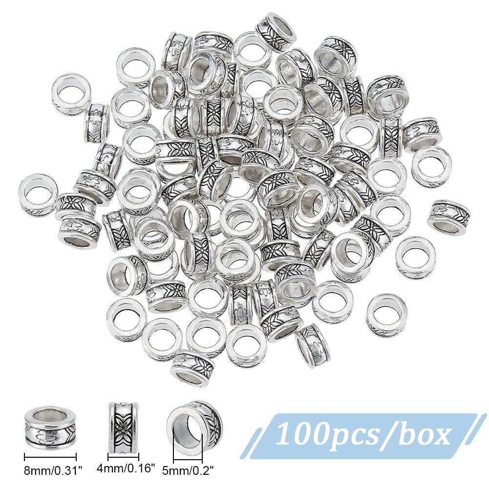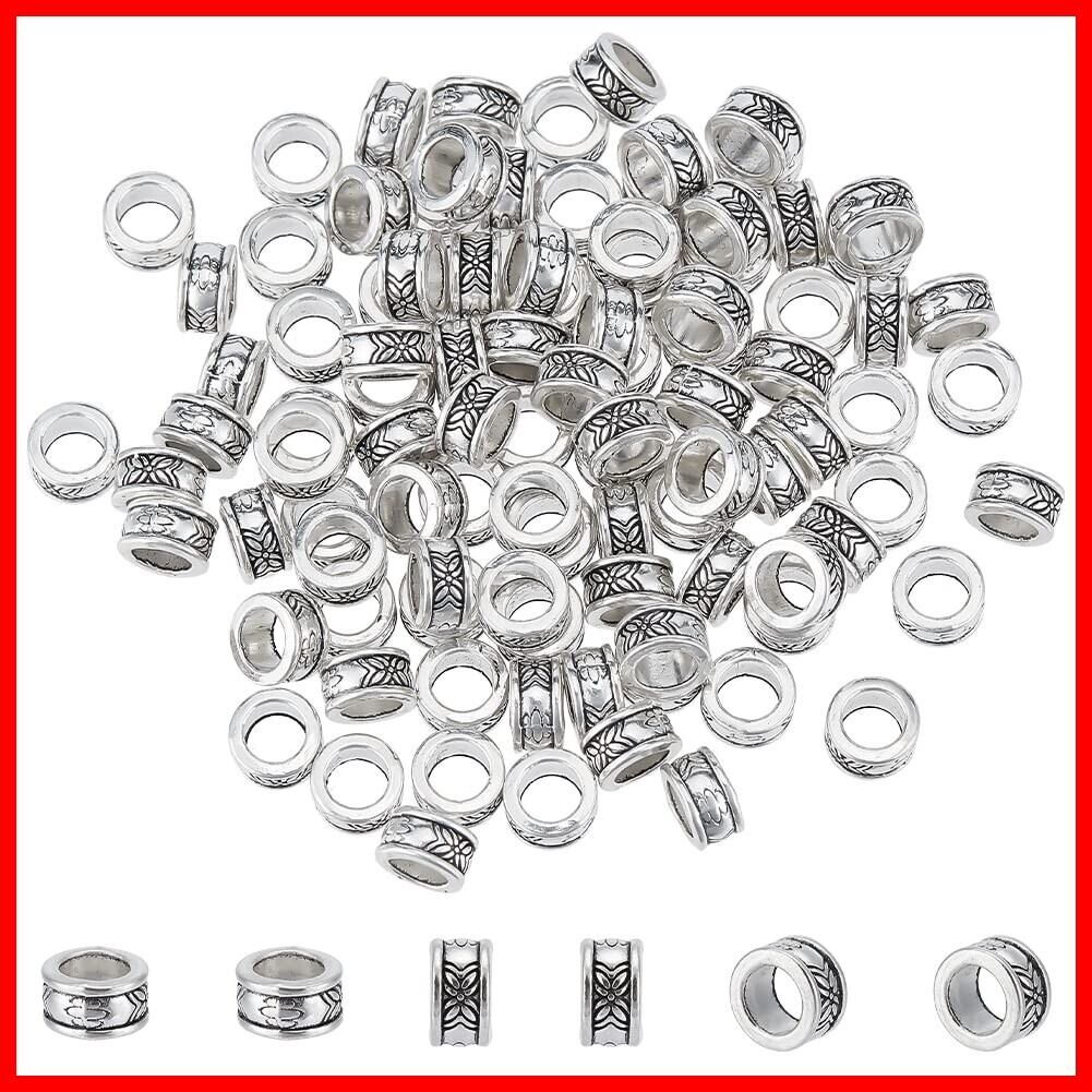 PH PandaHall 約100個 合金 スペーサービーズ 8mm 穴5mm コラム型 チベッ風 ビーズ ロンデル メタルビーズ チャーム ジュエリー製作 アクセサリーパーツ DIY用 クラフト 手作り素材 アンティークシルバー