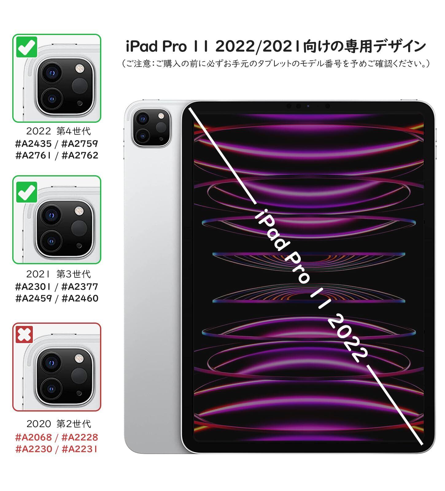 「iPad Pro 11インチ第4/3世代向け」 2022年新発売のiPad Pro 11インチ第4世代及び2021年に発売の第3世代向けに専用設計された保護ケースです。モデル番号:A2759/A2435/A2761/A2762(第4世代)、A2377/A2459/A2301/A2460(第3世代)。iPad Pro 11インチ 2024 第5世代/2020 第2世代/2018 第1世代(×)、又は他のモデルには適用しません。ご購入の前にタブレットの機種/モデル番号を予めご確認ください。