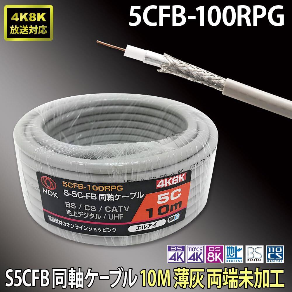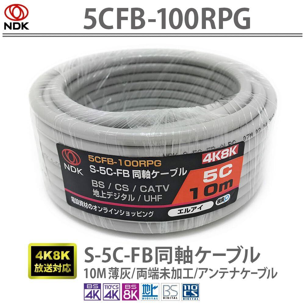 二幸電気工業 S5CFB 同軸ケーブル 10m 薄灰 (2K 4K 8K BS CS CATV 地デジ) アンテナケーブル 両端未加工 (5CFB-100RPG)