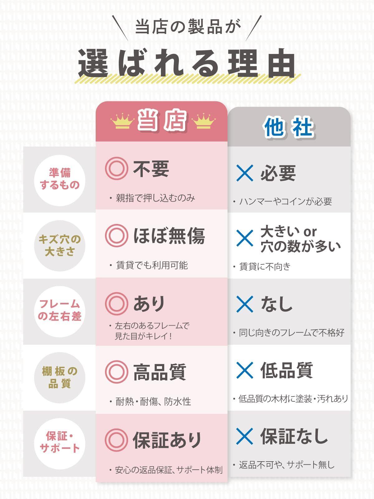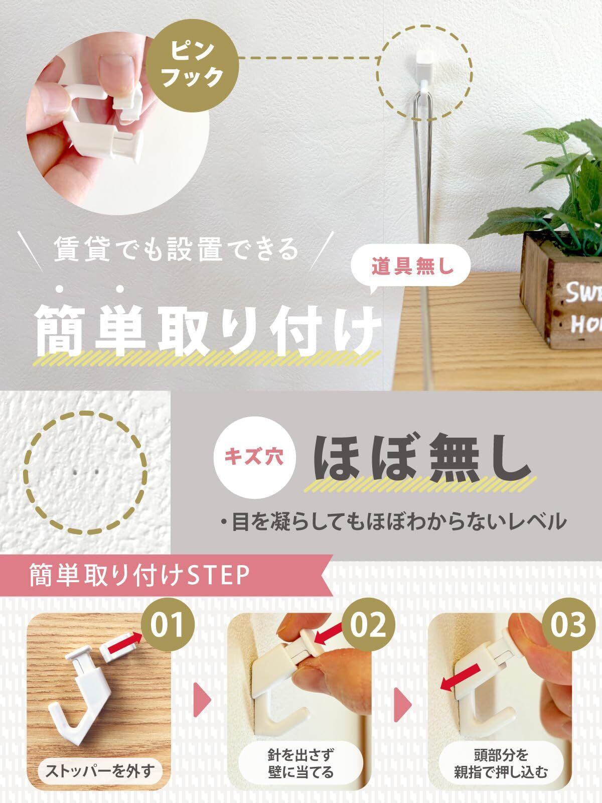 【賃貸OK&簡単取り付け】当店オリジナルのピンフックを使用することで、ウォールシェルフを壁に”ほぼ無傷”で取り付け可能。賃貸物件も◎ また、ドライバーなどの工具も必要なく簡単に取り付けできます。 ※取り付け方法は付属のピンフック、ネジからお選びいただけます。