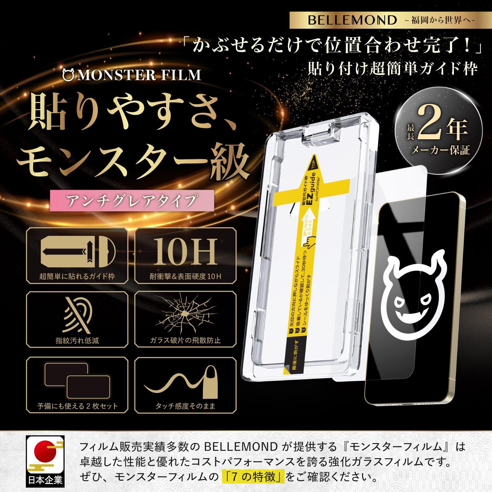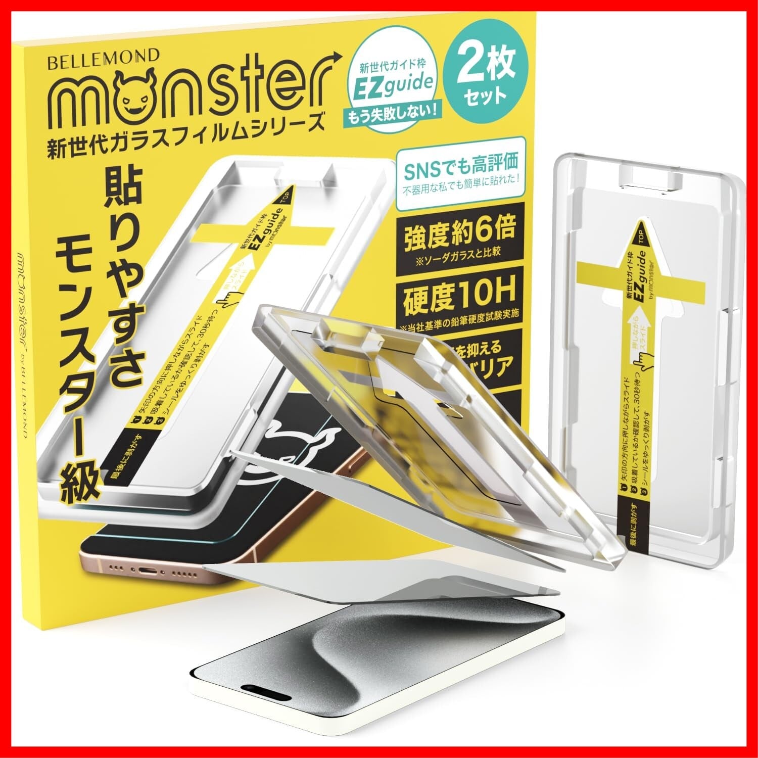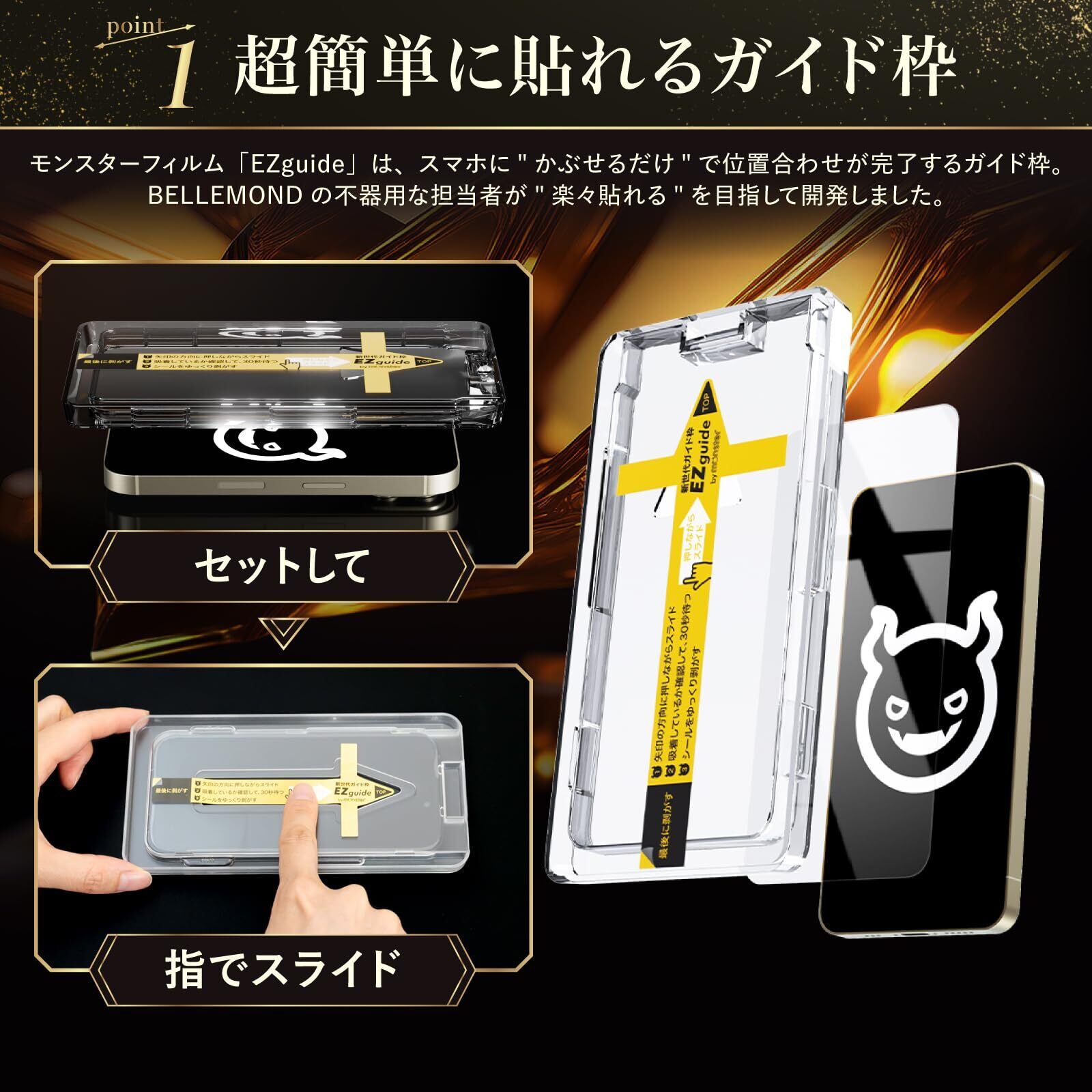 【カチャ、スー、パカッだけの簡単貼り付け】モンスターシリーズの「EZguide - イージーガイド - 」はガイド枠とガラスフィルムが一体型になった「ガイド枠一体型」貼り付けキットです。画面にガイド枠をかぶせるだけで、誰でも簡単に位置ズレのなく貼り付けが可能です。今までの貼り付け方に戻れないほど「簡単」で「貼りやすい」EZguideをぜひお試しください。