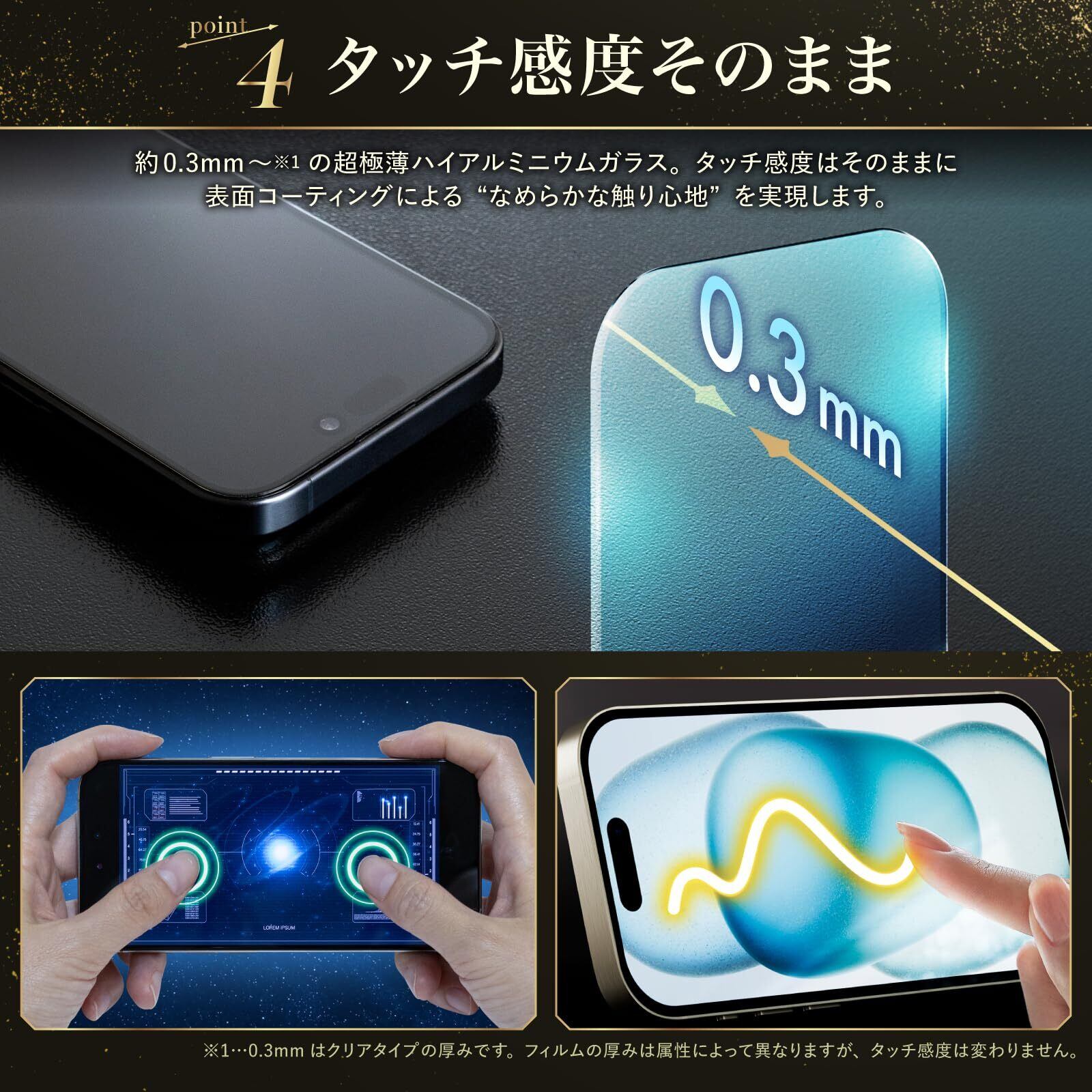 【指紋・汚れ防止】防汚コートにより指紋や汚れが付着しにくく、拭き取りやすくなります。 【スムースタッチ加工】特殊コートにより表面は滑らか。スムーズな指すべりで操作性が向上します。 【ラウンドエッジ加工】エッジを丸くして角割れを防止すると同時に、ひっかかりのない滑らかな触り心地を実現しています。 【ケースと干渉しない】ケースに干渉しないように設計し、有名のケースでの検証も行っております。 【飛散防止加工】万が一、ガラスフィルムが割れた場合でもガラスは飛び散りません。