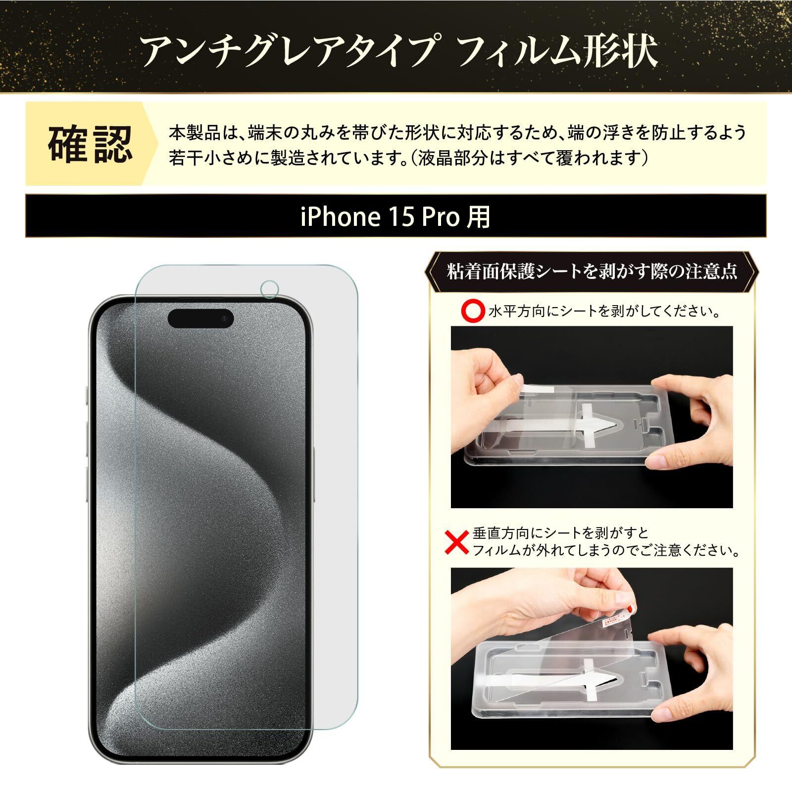 【対応機種】iPhone15 Pro (2023年) 用 【セット内容】ガラスフィルム 2枚(EZguide セット済み)、付属品 2セット (拭き取りシート、クリーニングクロス、ホコリ除去シール)【フィルムサイズについて】iphone15シリーズの画面は、丸みを帯びた形状となっております。当商品は端の浮きを防止するため、以下のサイズにて製造しております。(液晶部分は全て覆われております)実物は写真7枚目をご確認ください。