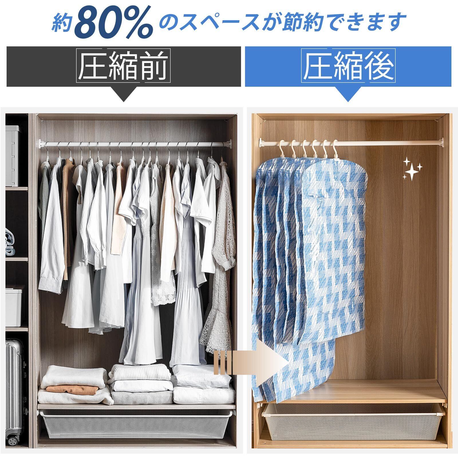 スッキリ収納:クローゼットに吊るして、衣類をすっきり収納できます。ジャケット、コート、洋服、スーツなど、散らかりやすい衣類をすっきり収納できる便利な吊り下げ式真空圧縮袋です。 ハンガーで、クローゼットに吊り下げて、服と一緒に管理できます。収納圧縮袋使わない時は折りたたんでコンパクトに収納出来ます