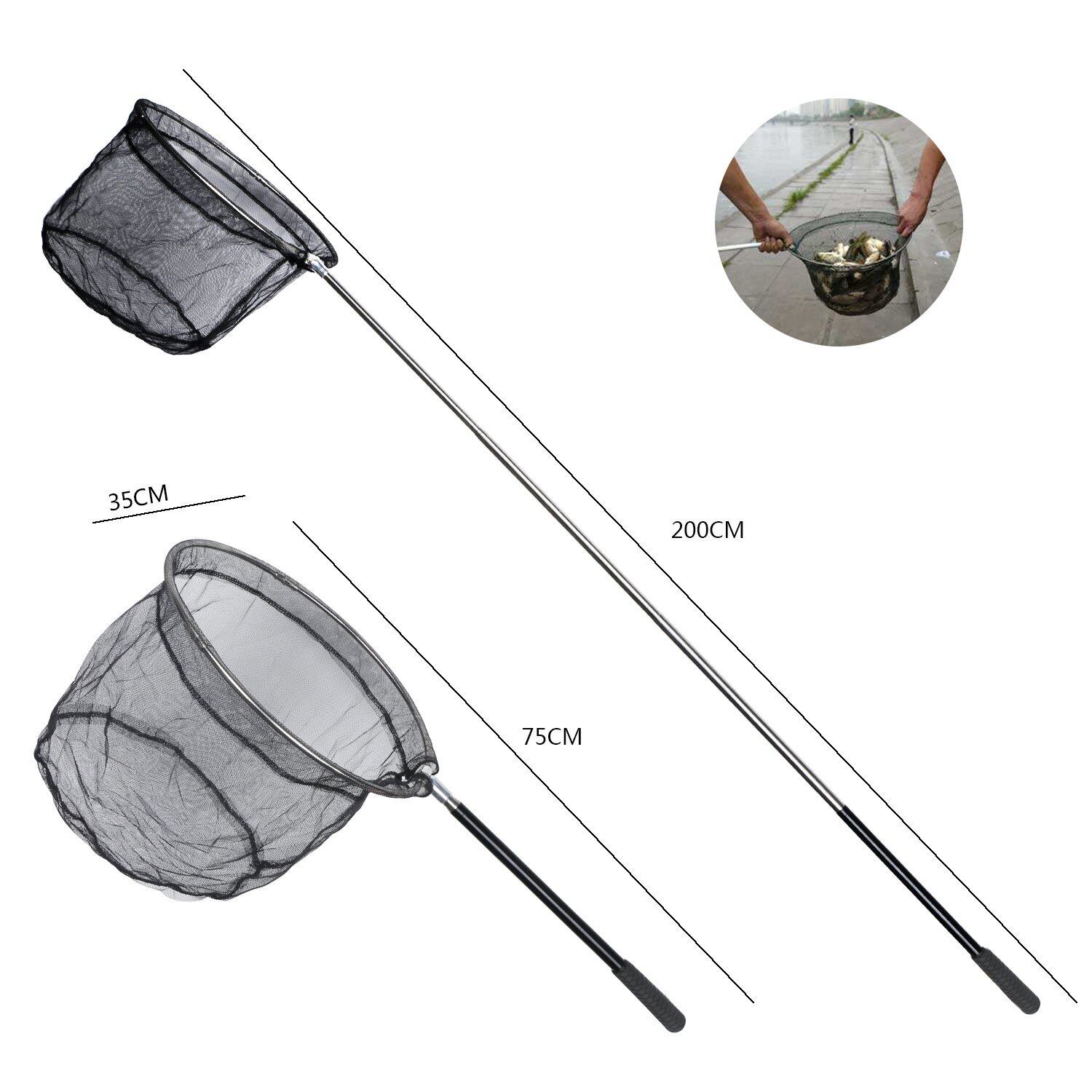 折りたためるタモ網全長:約205cm(柄の黒い部分も含め5段で網を装着した全長) 収縮時 :43cm 重さ :約350g 網深さ:約38cm、ナイロンコーティングネット。