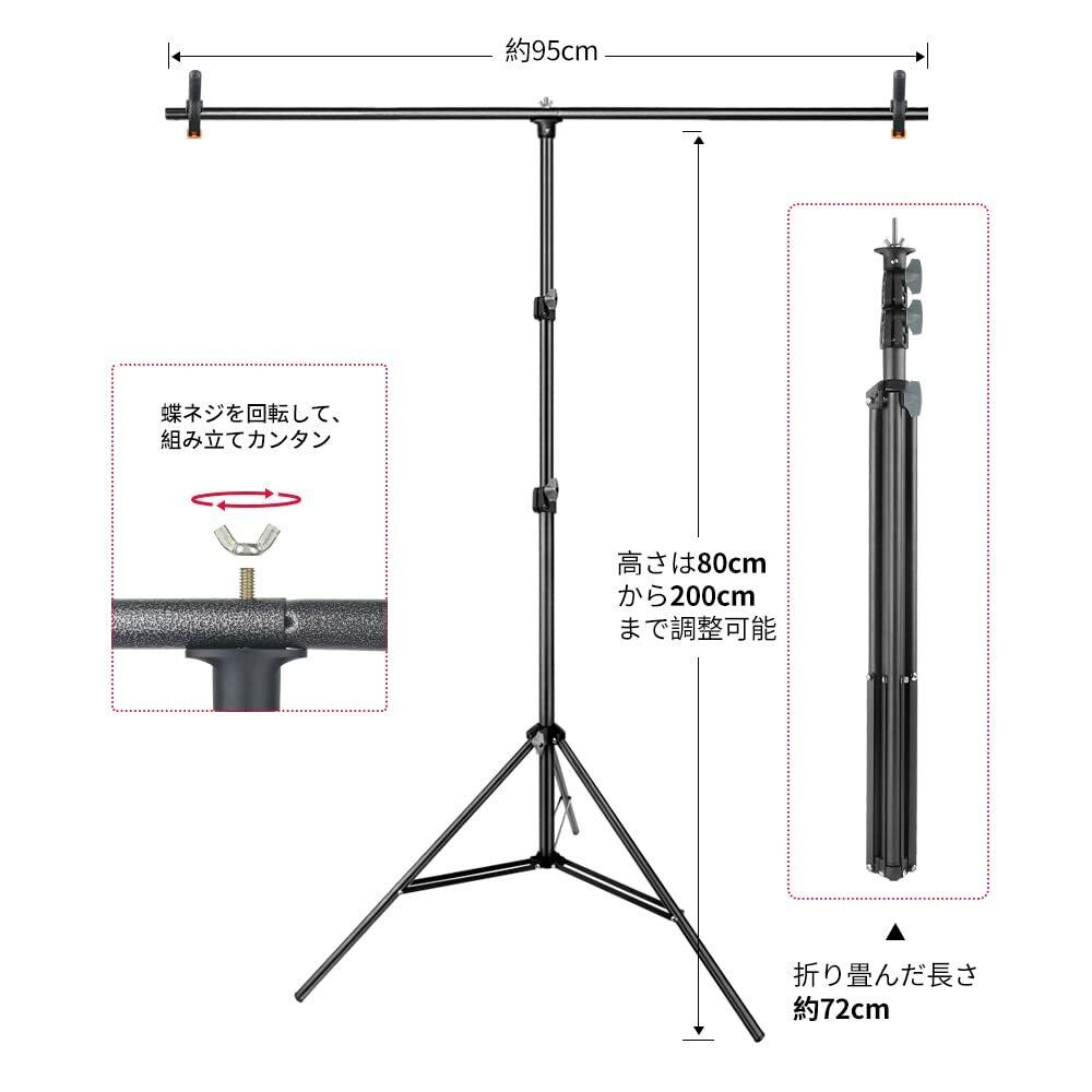 【高さ調節可能なT字型背景スタンド】ライトスタンドの高さは80cmから200cmまで調整可能で、クロスバーの幅は約95cmです。商品本体重量:約1.2kg