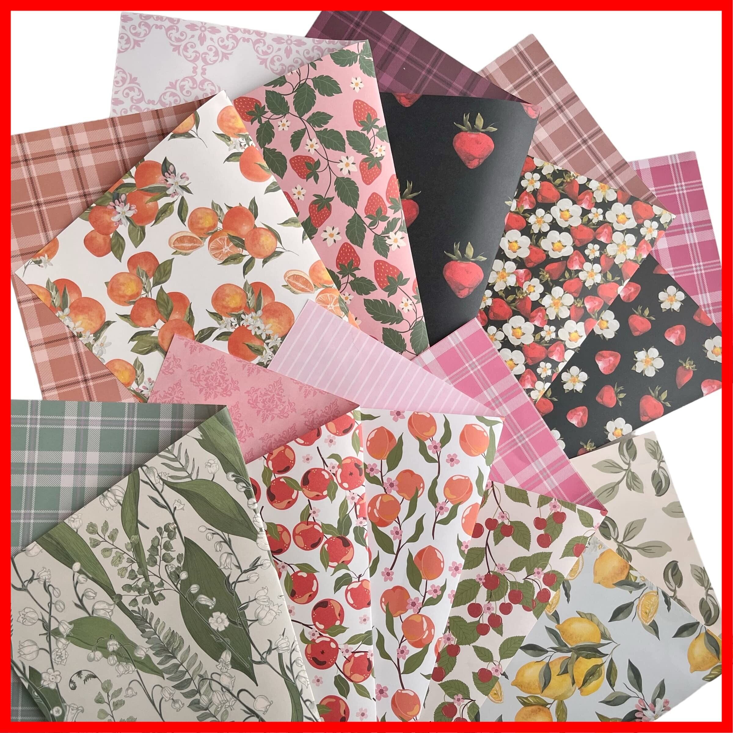 A4サイズのオリジナルデザインペーパー です。両面印刷。果物とすずらんの植物のセット。果物は、苺、さくらんぼ、レモン、オレンジ、りんご、桃の可愛いデザインです。裏面もチェック柄印刷されています。両面お好きな柄をお使いください。 コピー用紙よりも厚め0.12mmの上質紙90kgを使用。 包装紙、コラージュ素材、ブックカバー、台紙、工作、POP、表紙、などなど使い道自由です。 ※パソコン上の色味と現実の色味は異なる見え方がある場合がございます。