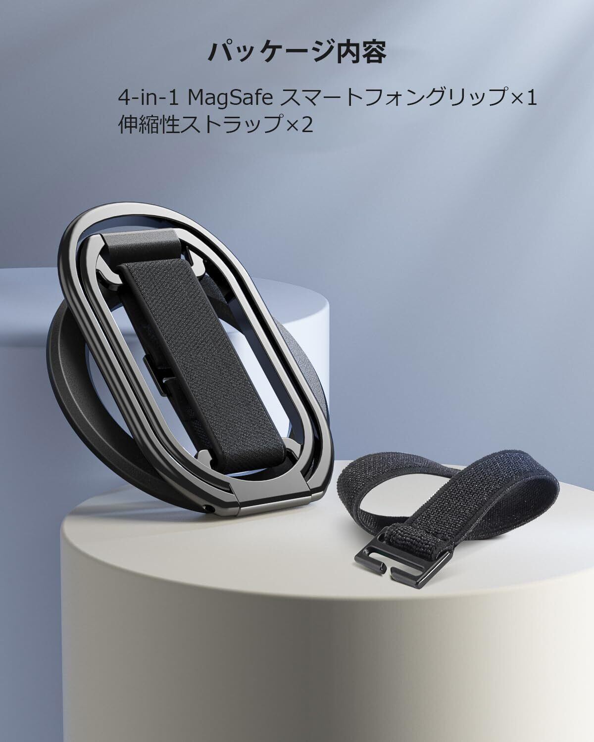 特徴 指ストラップ付き, MagSafeマグネット, 調整可能, 交換可能なベルクロストラップ, MagSafeマグネット, 二段階調節, 折り畳み式