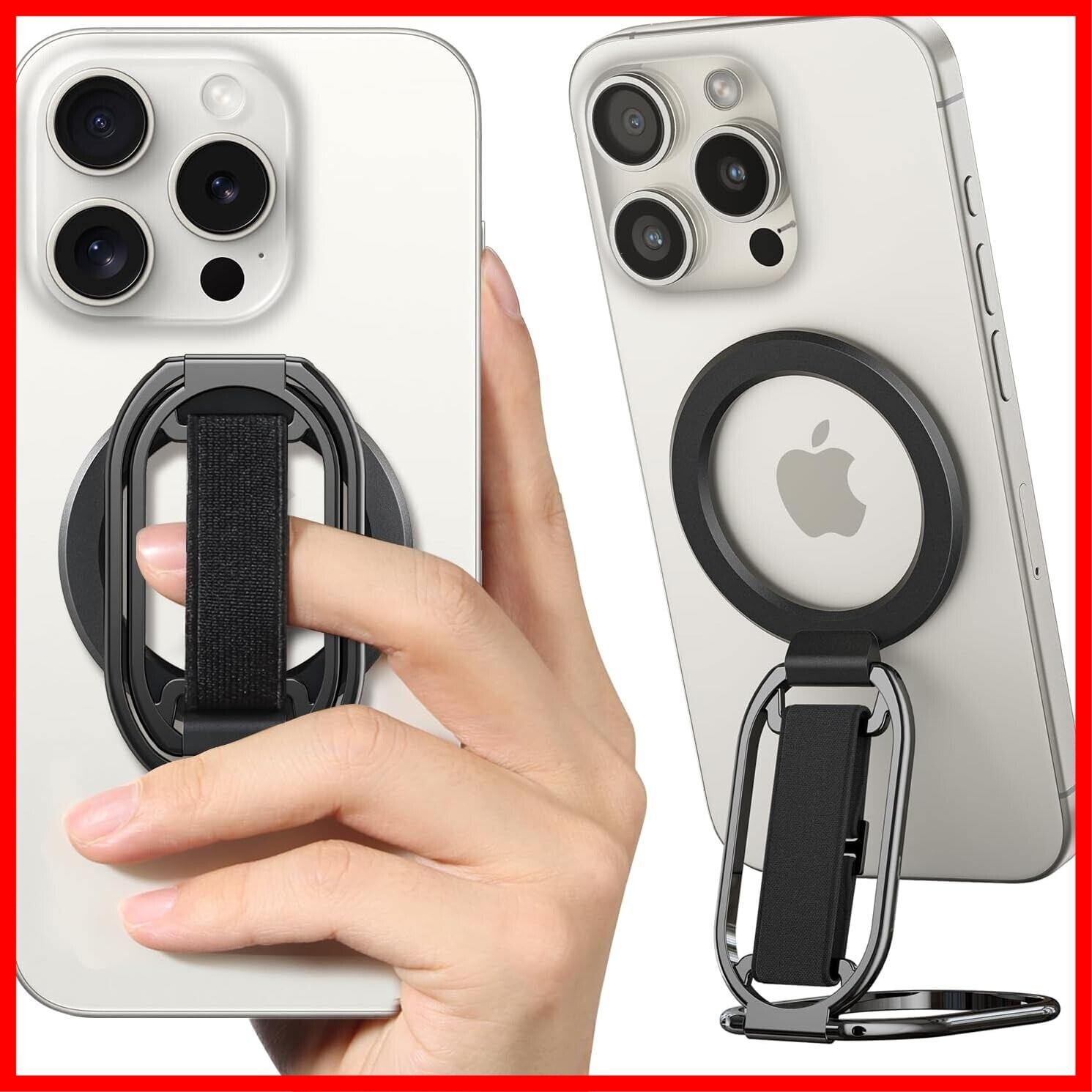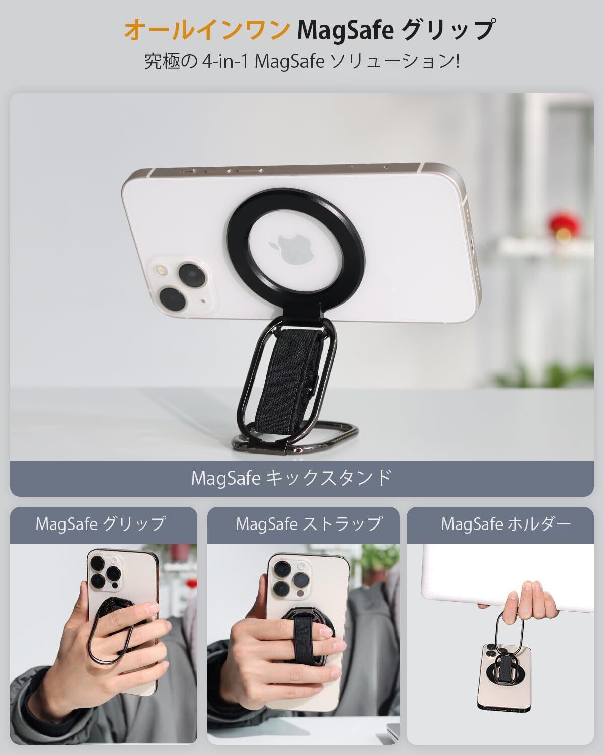 【 4-in-1 最新構造 】 enGMOLPHY MagSafe対応バンカーリンググリップ マグセーフキックスタンド マグネッツフィンガーループ 磁気リングホルダーストラップ 取り外し可能 安定性, 【iPhone 12/13/14/15/16シリーズ用 】 マグセーフ対応アクセサリー(黒)