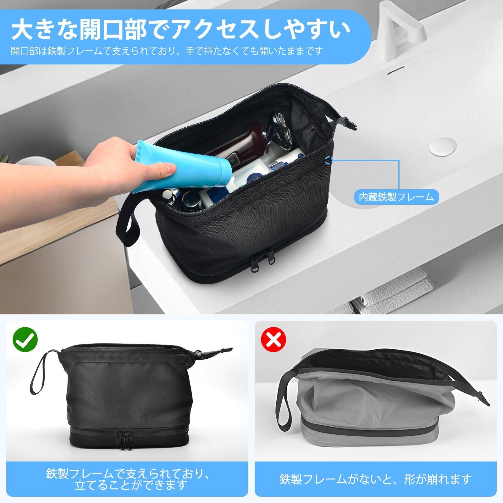 大開口化粧ポーチ:この旅行用ポーチオーガナイザーは、大きなジッパー開口部を備えており、移動中でも必要なものを素早く見つけることができます。開口部は頑丈な鉄製フレームと組み合わされており、バッグが自立して倒れないように設計されています。また、バッグの形状が崩れたり倒れたりするのを防ぎ、洗面台やデスクの上に簡単に置くことができます