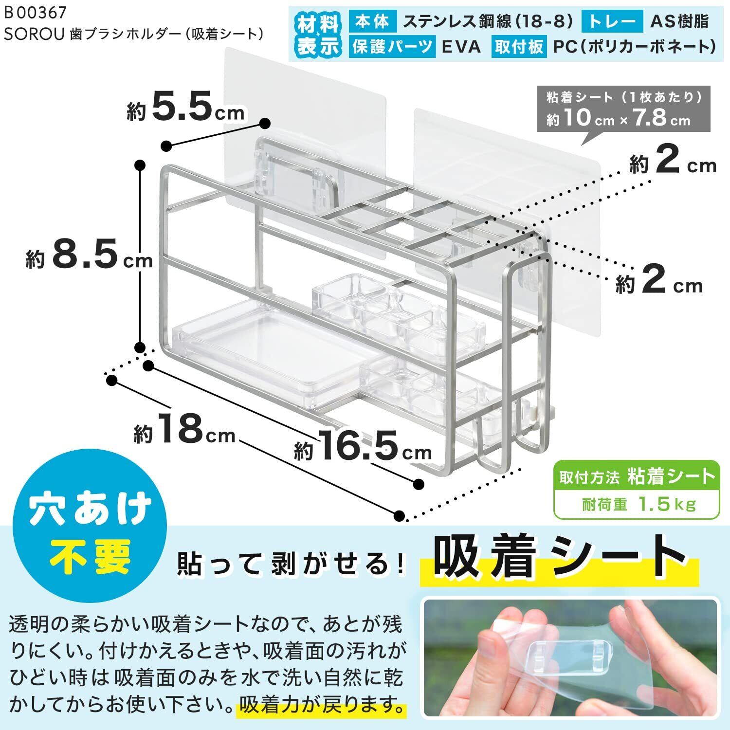 SORO:U ステンレス 歯ブラシホルダー (抗菌トレー) 吸着シートで壁面取付け