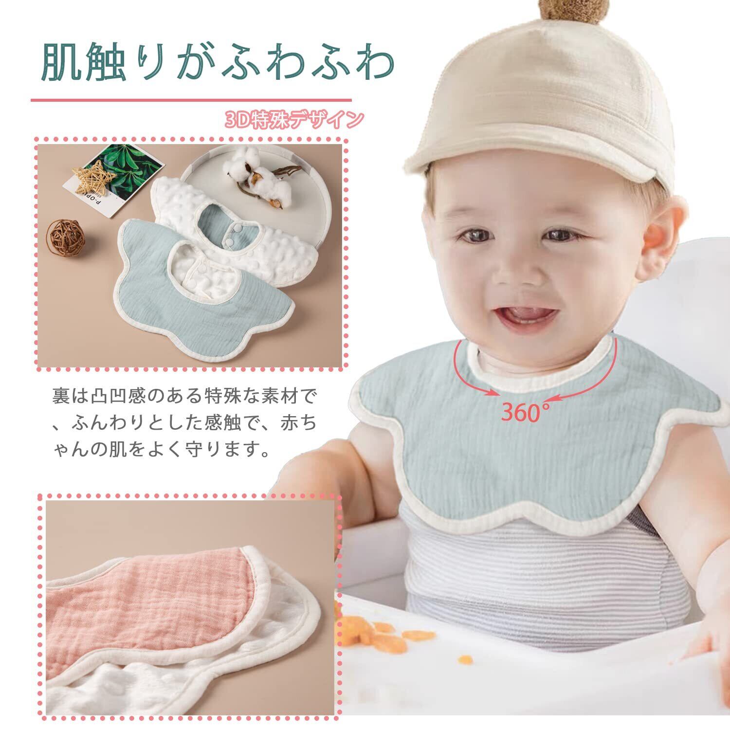 【360°スタイ 】360度回って使える。一端が濡れたら回せば引き続き使える。赤ちゃんのよだれに困っているお母さんたち、是非使ってみてください!