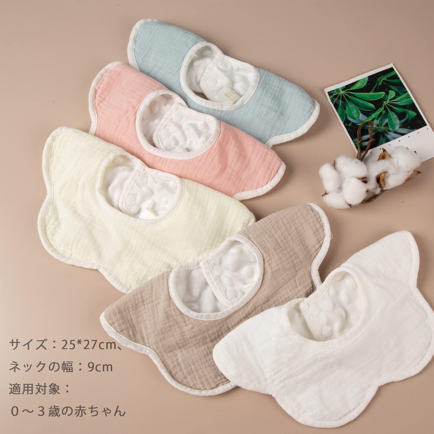 【セットの内容】かわいい無地のよだれかけはワンセット5枚があるので、お母さんは好きなように赤ちゃんに服を合わせることができます。派手ではなく、落ち着いたデザインや色合いが好きな人におすすめです。 サイズ:25*27cm、ネックの幅:9cm、0-3歳の赤ちゃんにぴったりのスタイです。