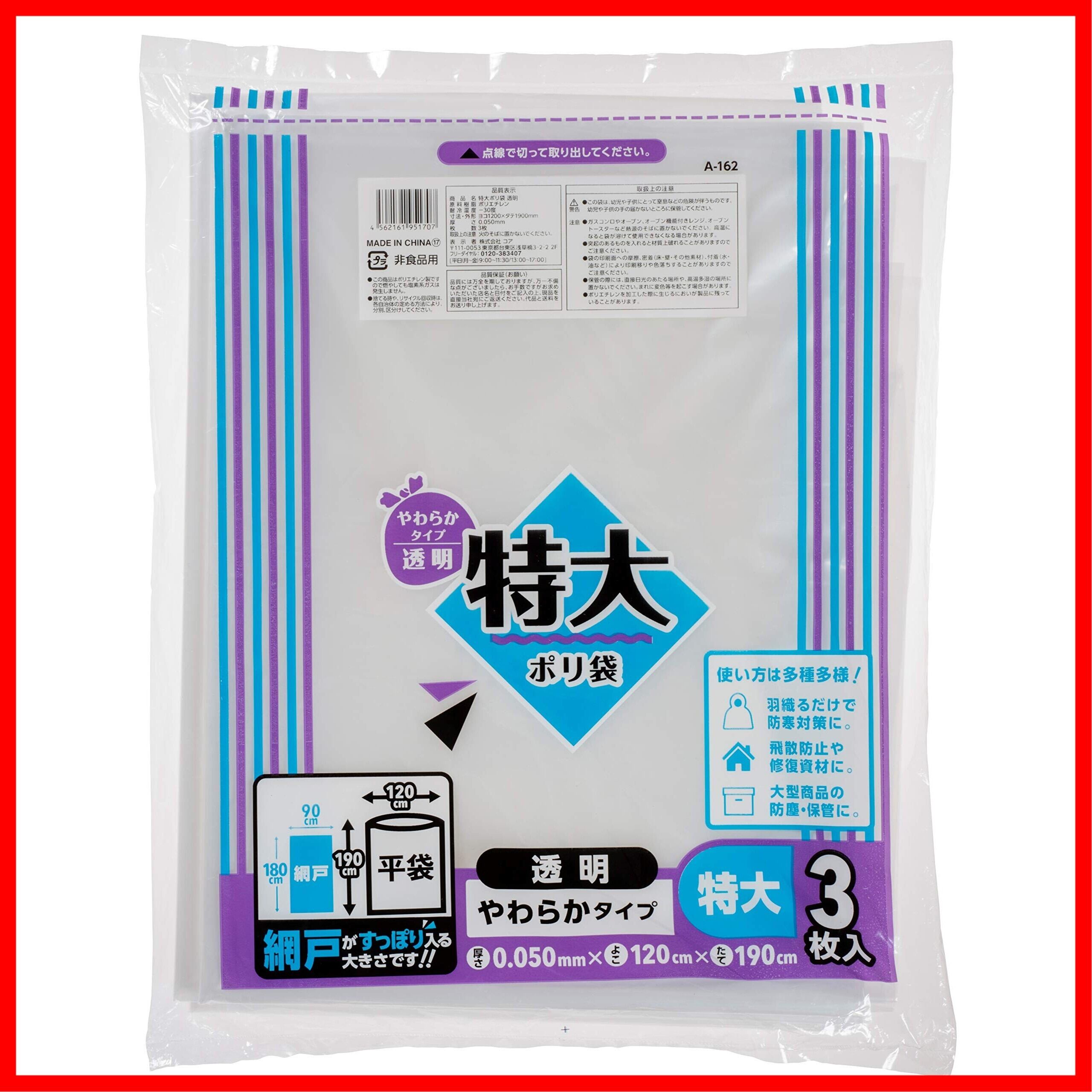コア ゴミ袋 横120cm×縦190cm×厚み0.05mm 透明 特大 ポリ袋 やわらかタイプ 3枚入 A-162