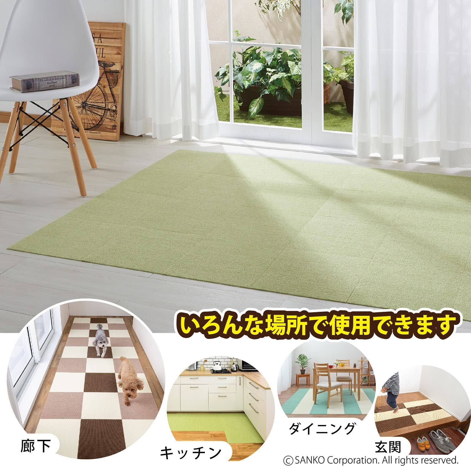 Sanko 【日本製 撥水 消臭 洗える】サンコー ずれない タイルカーペット ペット用 30×30cm グリーン 8枚 カーペットタイプ おくだけ吸着 タイルマット ジョイントマット KN-13
