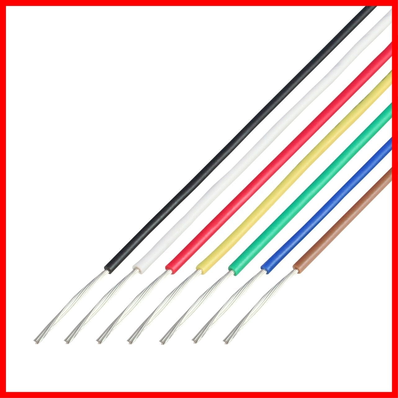 AWG24のUL耐熱ビニル絶縁電線を2mに切断し1袋に7色(黒・白・赤・黄・緑・青・茶)同梱しています。