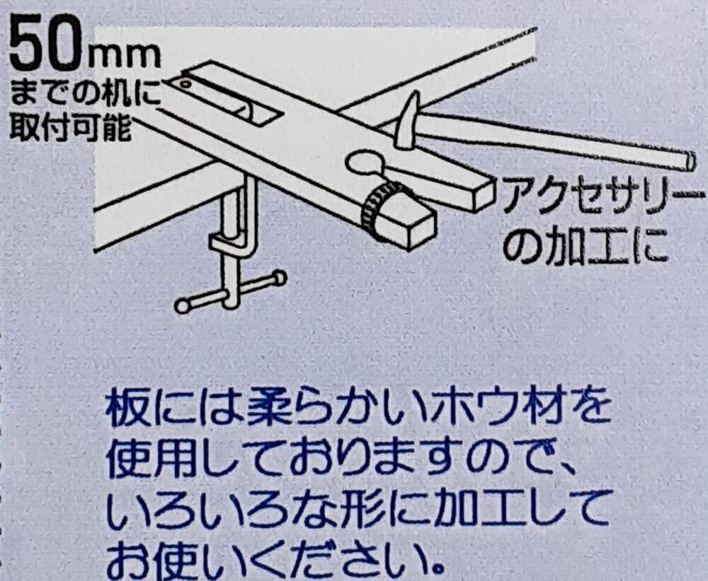 クランプに木台を取り付け、机に固定できます。やわらかい板材を使用しているので、アクセサリーの加工に合います。