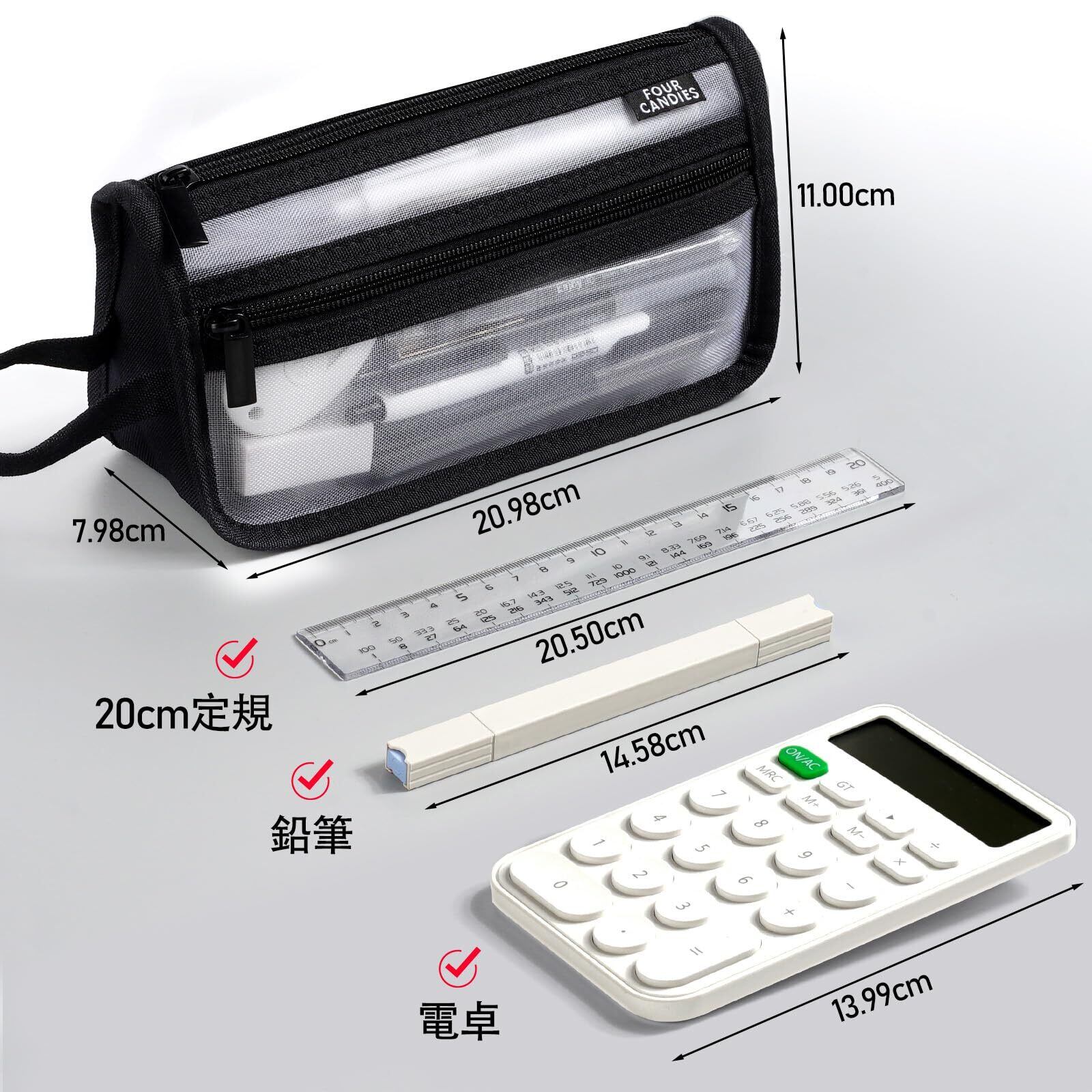 Four Candies ペンケース 筆箱 透明 メッシュポーチ 大容量 ハンドルとジッパー付き クリアダブルレイヤー筆箱 マーカーポーチ 旅行化粧バッグ 女の子 男の子 大人のオフィスや学生のための可愛い透明文房具-ブラック