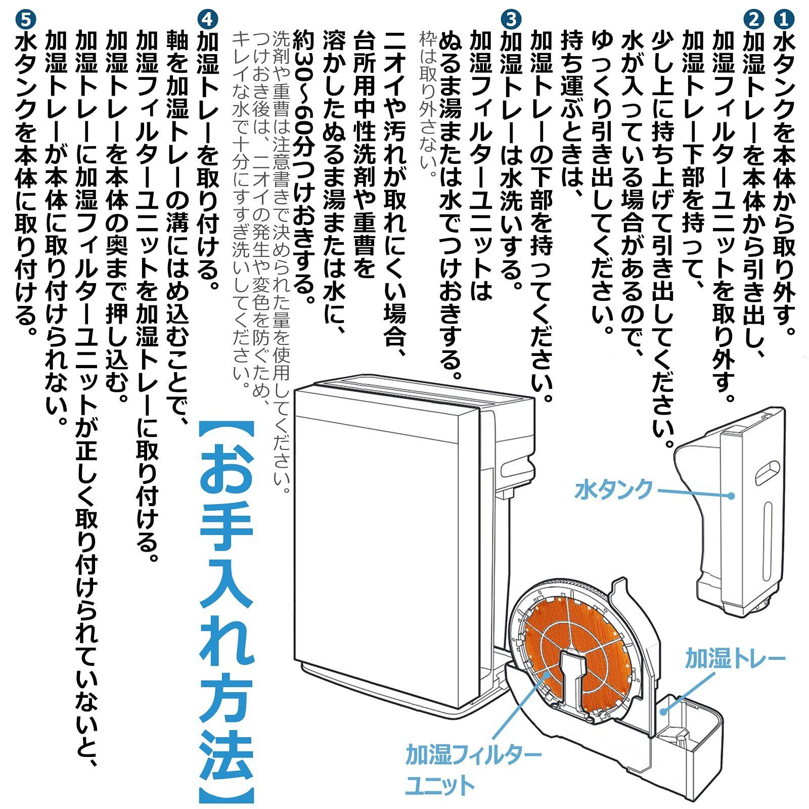 【お手入れ目安】約1ヵ月に1度、またはニオイや汚れが気になるとき。1シーズンに1回、または水あか(白や茶色)が取れにくいときはクエン酸による浸け置く。ご使用環境により加湿フィルターの汚れかたは異なる。吹出口からニオイがしたり、加湿量(水の減りかた)が少なくなったと感じたときは、お手入れすることをおすすめ。