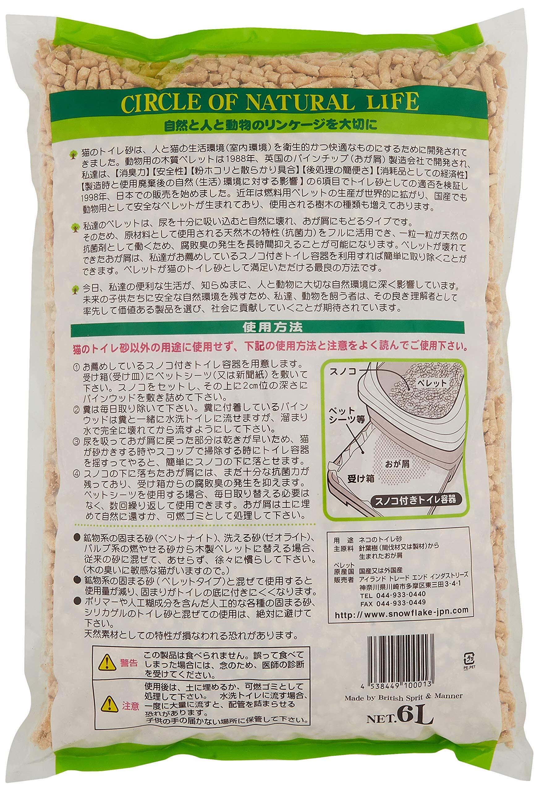 天然木100%の抗菌力でペットもお部屋も清潔に! ・土から生まれた製品を土に還す思想を基に自然へのリサイクルを可能にすることで、自然保護と再生に貢献できます。天然の抗菌力が飼育環境を衛生的に保ちます。 ・100%天然素材だから燃やしてもダイオキシンを発生せず、動物や赤ちゃんが口にしても危険のない環境を提供します。 ・天然木が持つ抗菌力が、尿の腐敗臭の発生を抑制します。 ・二次公害の恐れもなく、可燃ごみで処理ができ、土にも簡単にもどせます。糞のついた部分は、糞と一緒に水洗トイレに流せます。 ・ホコリも少なく、足にも付きにくいので、トイレまわりを汚さず、掃除が楽になります。スノコ付き(専用)トイレを使用すれば、3~5日に一度の掃除ですみます。 ・100%天然木の素材だから、ホコリを吸いこんでも、特に仔猫には安全です。 ・卓越した吸水力で、1か月の使用量は約6Lですみ、非常に経済的です。 ・製品の生産は、すべて植林計画に基づいた間伐材のみ使用しています。