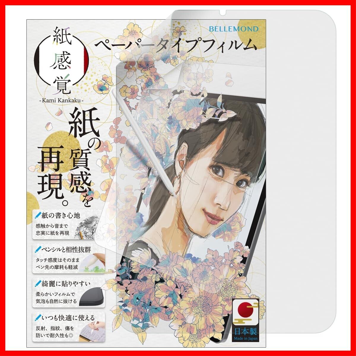 【BELLEMOND「紙感覚」とは】:紙感覚はBELLEMONDが2019年より販売している日本国内製造ペーパータイプフィルムです。紙と鉛筆を使った時のような摩擦係数を追求し、紙のような描き心地を再現しています。iPadをキャンバスにしてイラストを描く、学校でのノート代わりに使う等、iPadをもっとクリエイティブに使うためのフィルムです。